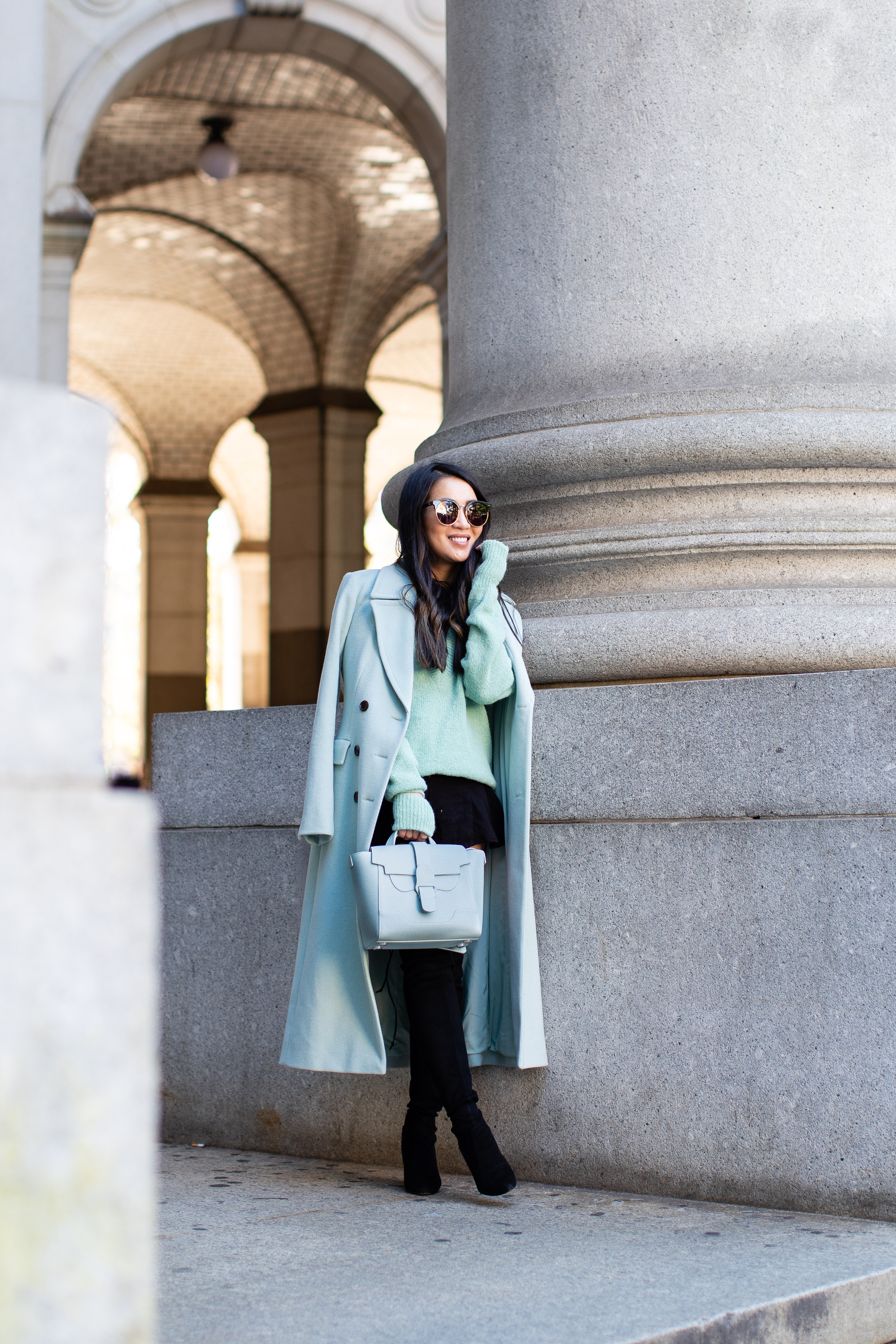 Freshness captured in an outfit! Fresh mint from bag to coat, I love this color story! It’s so chic, incredibly uplifting, and a great color to add to any wardrobe.