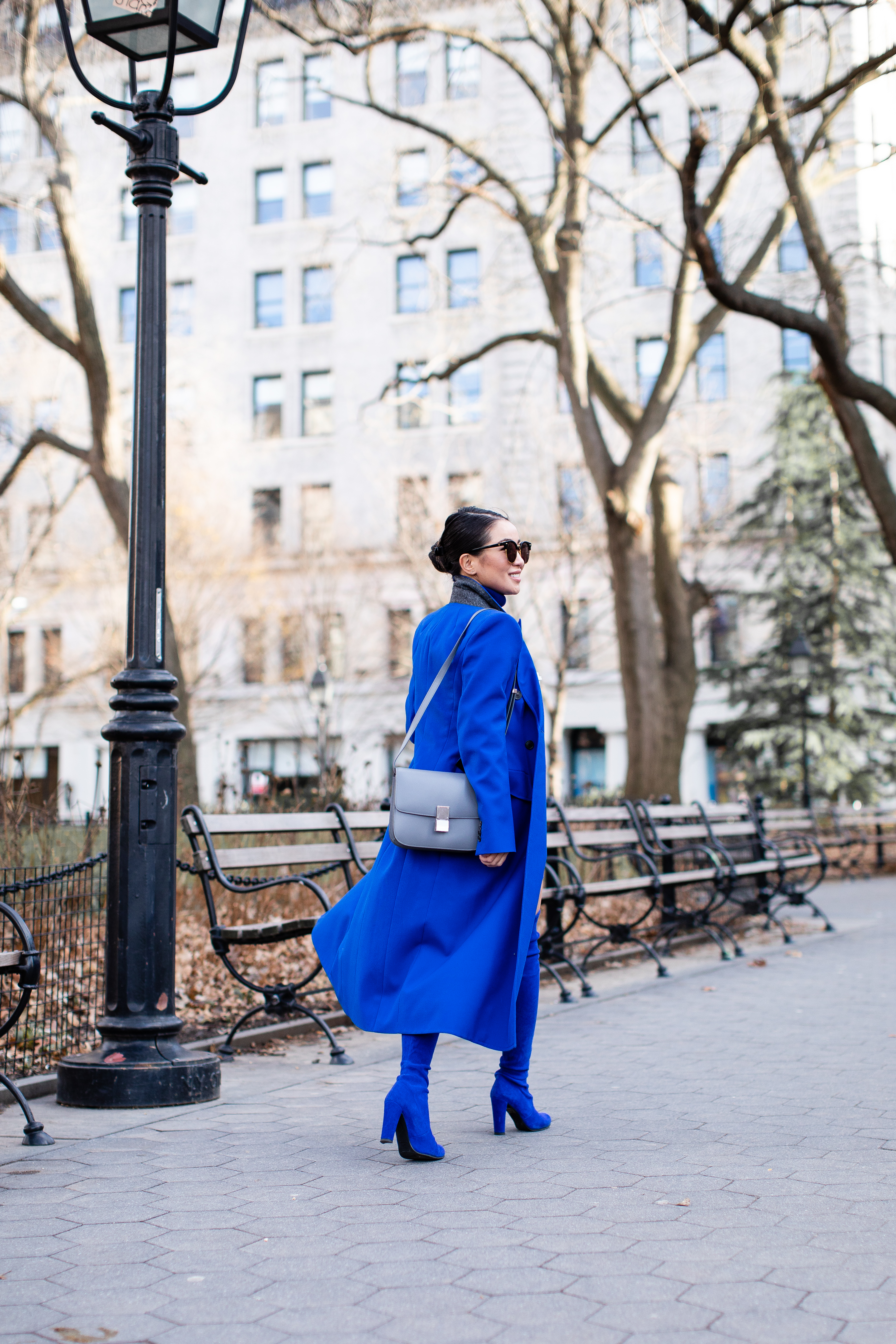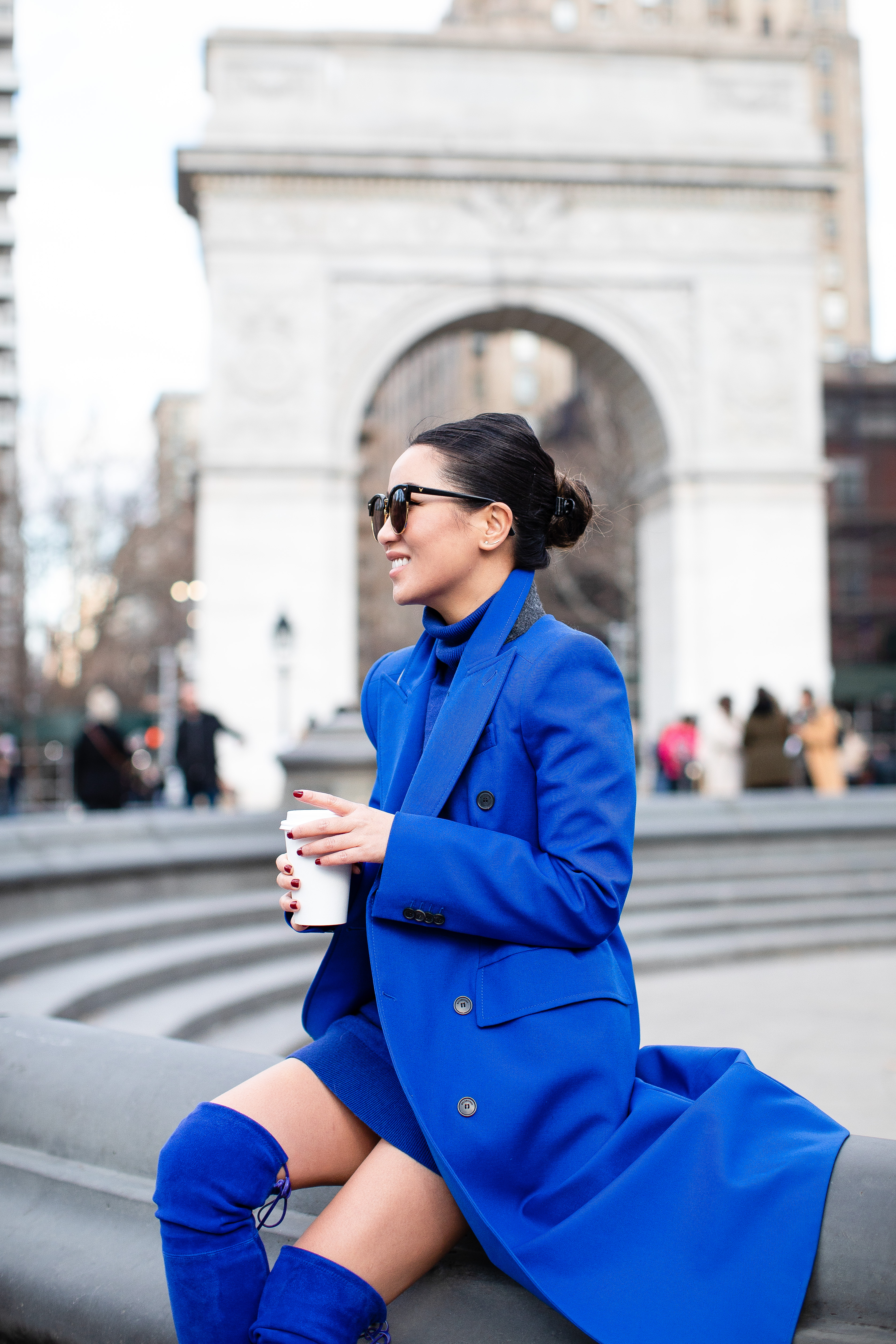 As you already know, I’m a huge fan of monochromatic looks. Impactful, easy to style, and uplifting, monochromatic outfits are my go-to every winter season. All blue is one of my favorite combos. It’s striking in person and still very wearable. This blue coat (similar Sam Edelman blue coat, under $150) is a statement piece. It’s stunning with an all blue outfit, beautiful with a simple black sweater and jeans, and powerful with an all white look.