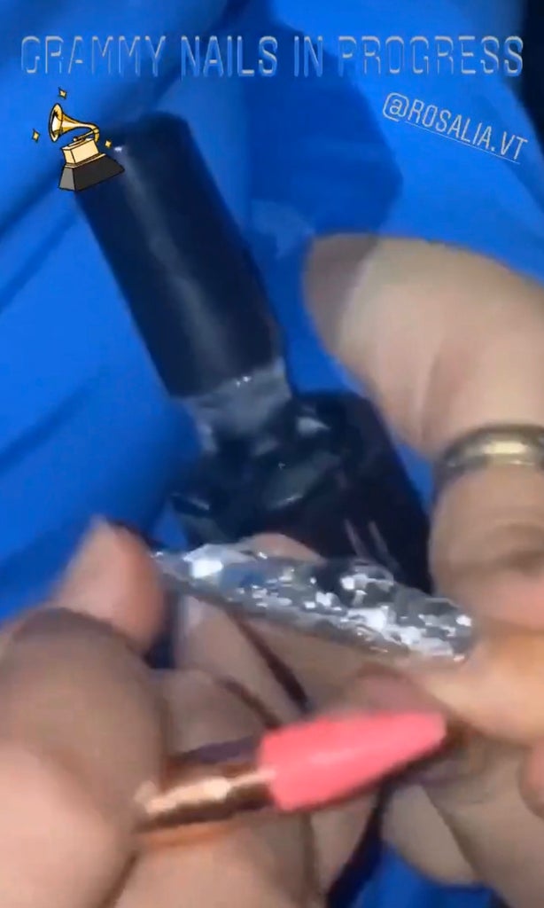 A fan page for Rosalía’s nails (yes, just her nails) also posted a shot of crystals and clear gel being applied in the same backseat. “Grammys Nails In Progress,” wrote the fan account.