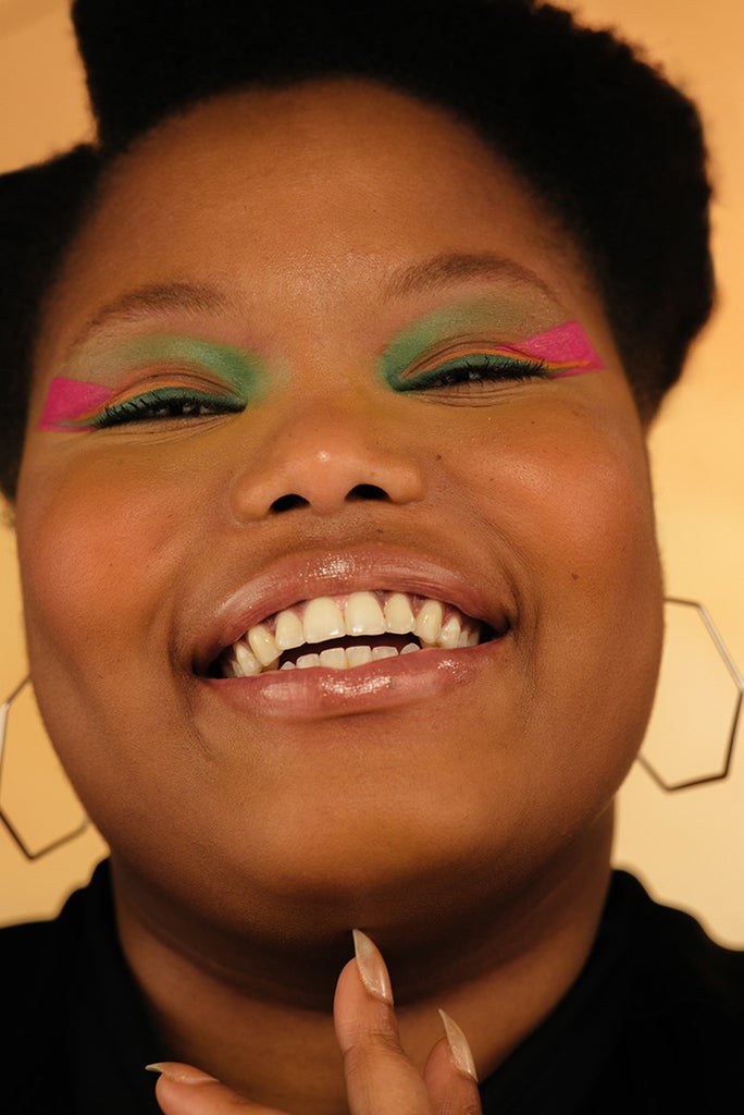 I feel the most like myself in theatrical and editorial makeup that involves lines, colors, textures, and shapes — anything with unplanned, 3D, or freehand designs. I believe makeup is art, and when I put on makeup to go out, it’s like working on a piece of art. I love having color choices, like with this retro ’80s colorblocked eyeshadow. It takes pops of greens and pinks to a whole new level.
