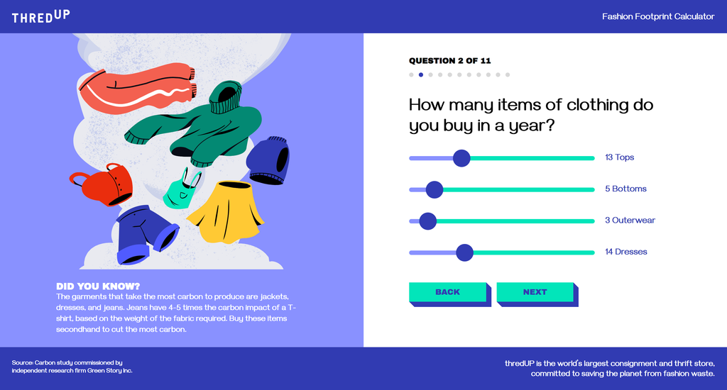 ThredUP’s new Fashion Footprint Calculator asks users a series of questions about the way they shop, including how they buy clothes (and whether they buy sustainable brands); how they clean their clothes (both laundry and dry cleaning); if they rent their clothing; and how often they return stuff. The tool then calculates the annual carbon footprint of the user’s closet. It also shares the best ways to reduce that footprint, with explanations about how these actions make a direct impact. There’s even an “Eco-directory” that promotes sustainable brands, and “green” shopping discounts.