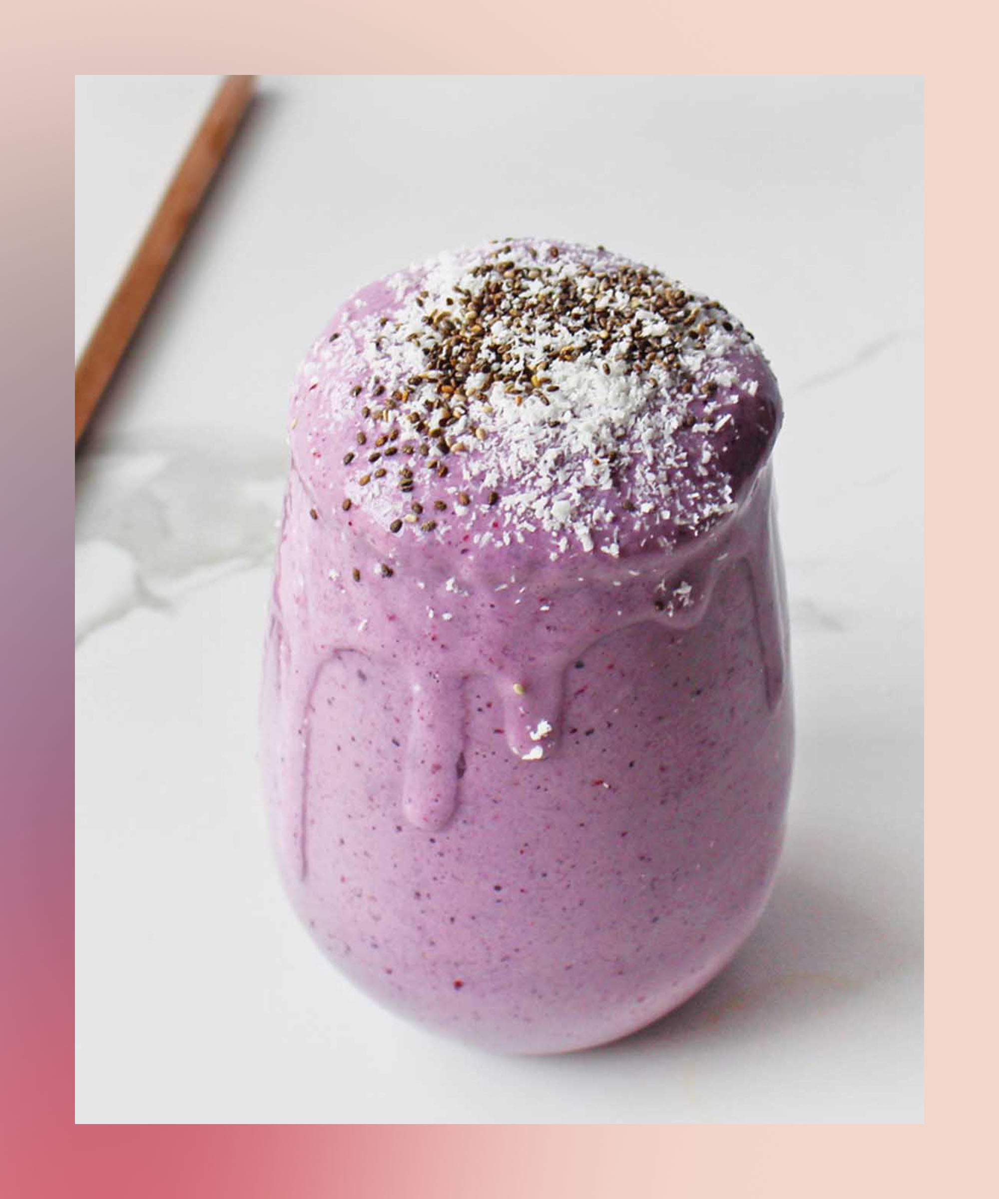 This recipe is perfect for mornings when you’re in a hurry, as it only takes five minutes to throw together. It contains spinach for a hit of green and chia seeds or psyllium husk for fiber to keep you satiated for hours.