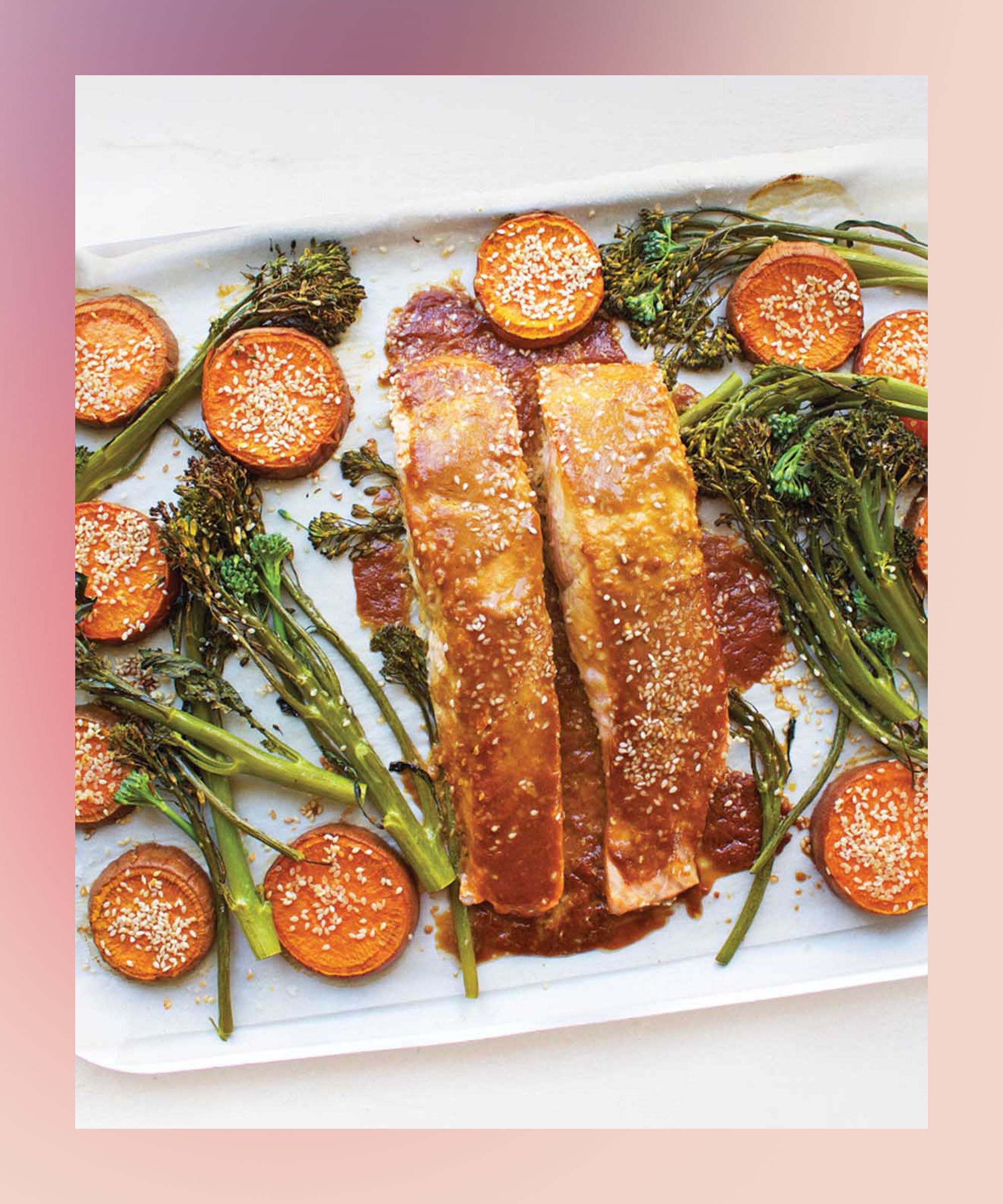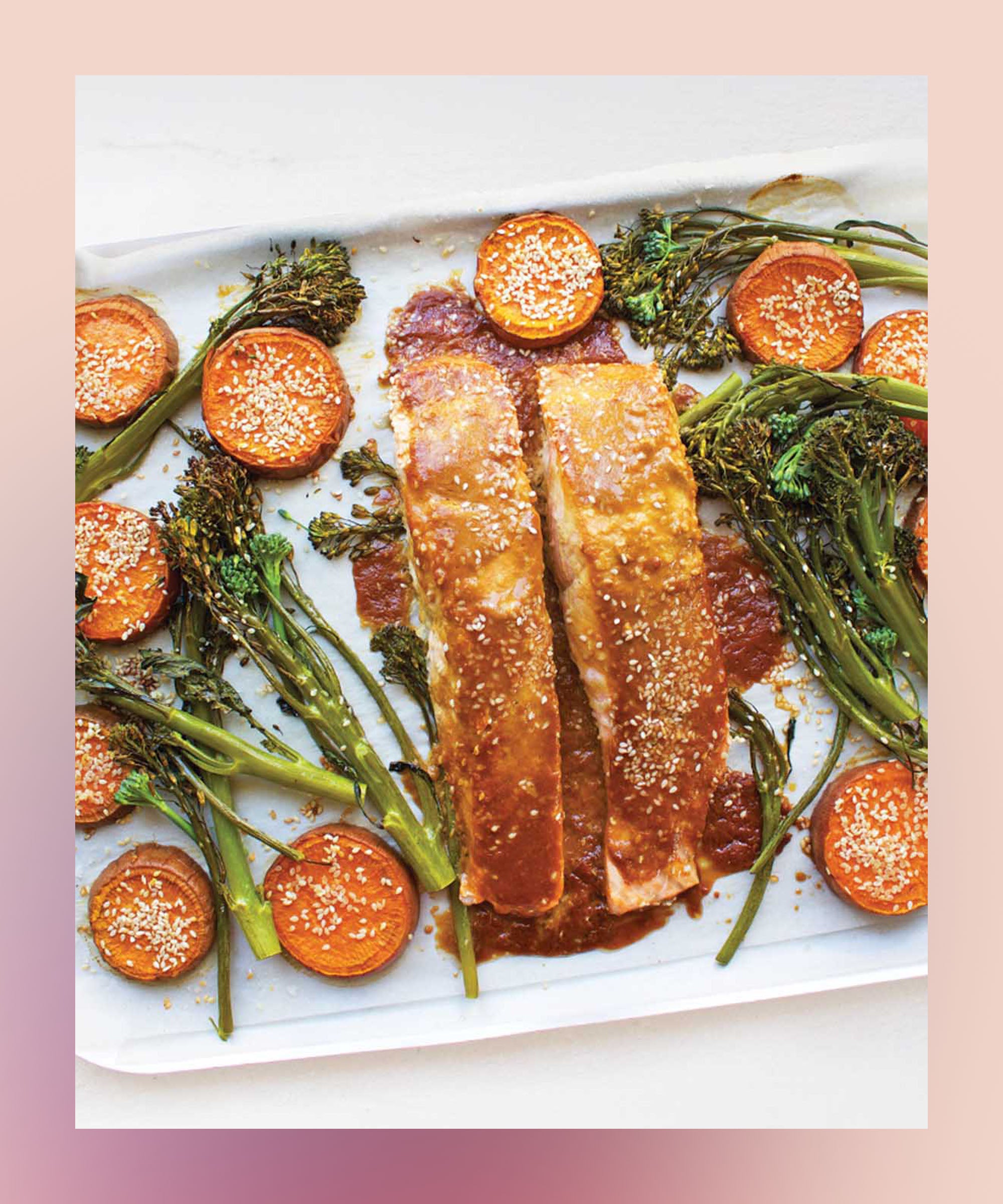 4) Remove the tray from the oven and add the broccolini. Drizzle the remaining coconut oil and another sprinkle of sea salt. Next, place the two salmon fillets in the middle of the baking tray and drizzle with the marinade. Place in the oven for 12 to 15 minutes, or until it's cooked to your liking. Serve with brown rice, if desired.