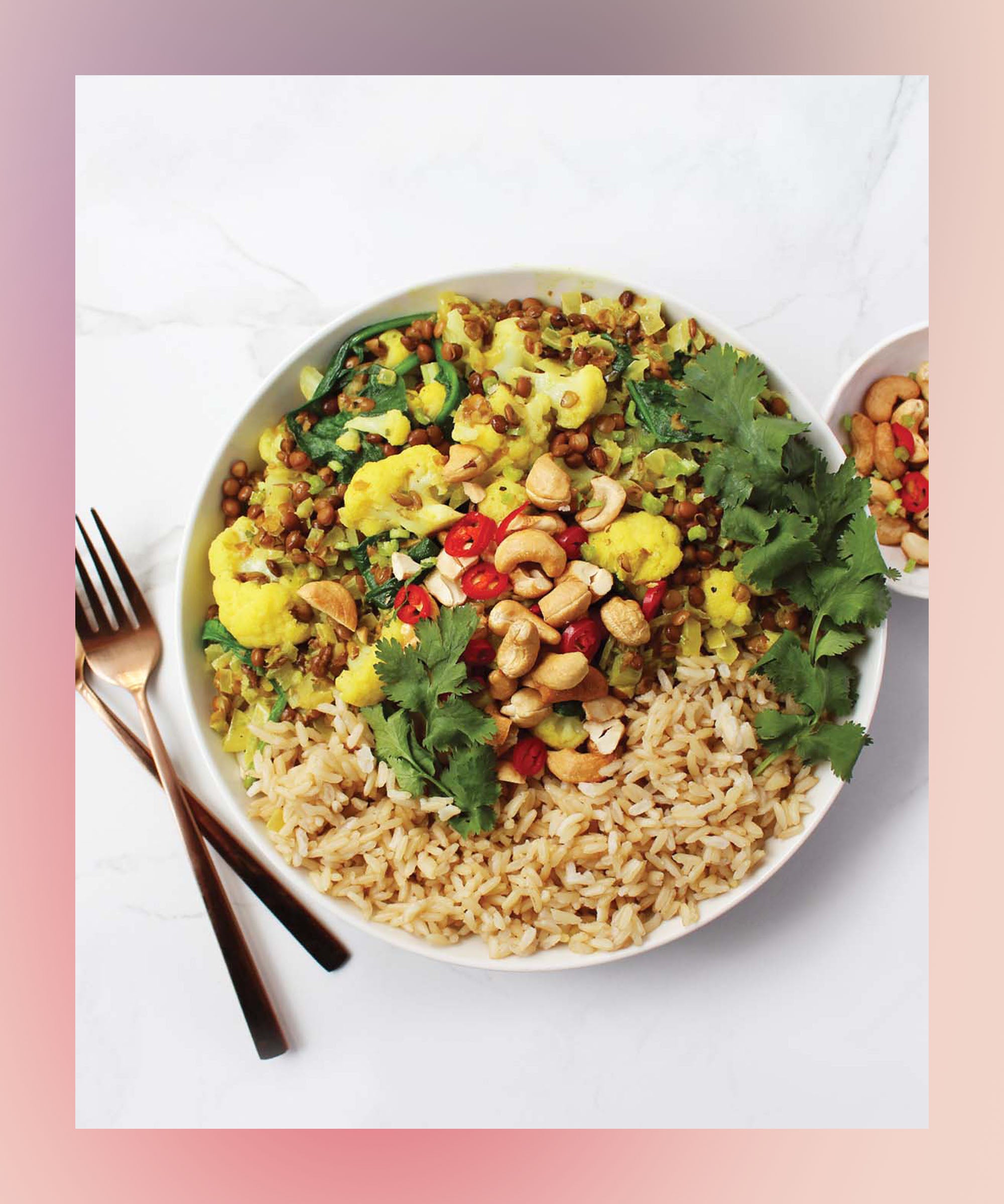 4) Serve with brown rice or quinoa, toasted cashews, chili and coriander leaves, if using.Photo: Courtesy of JSHealth.