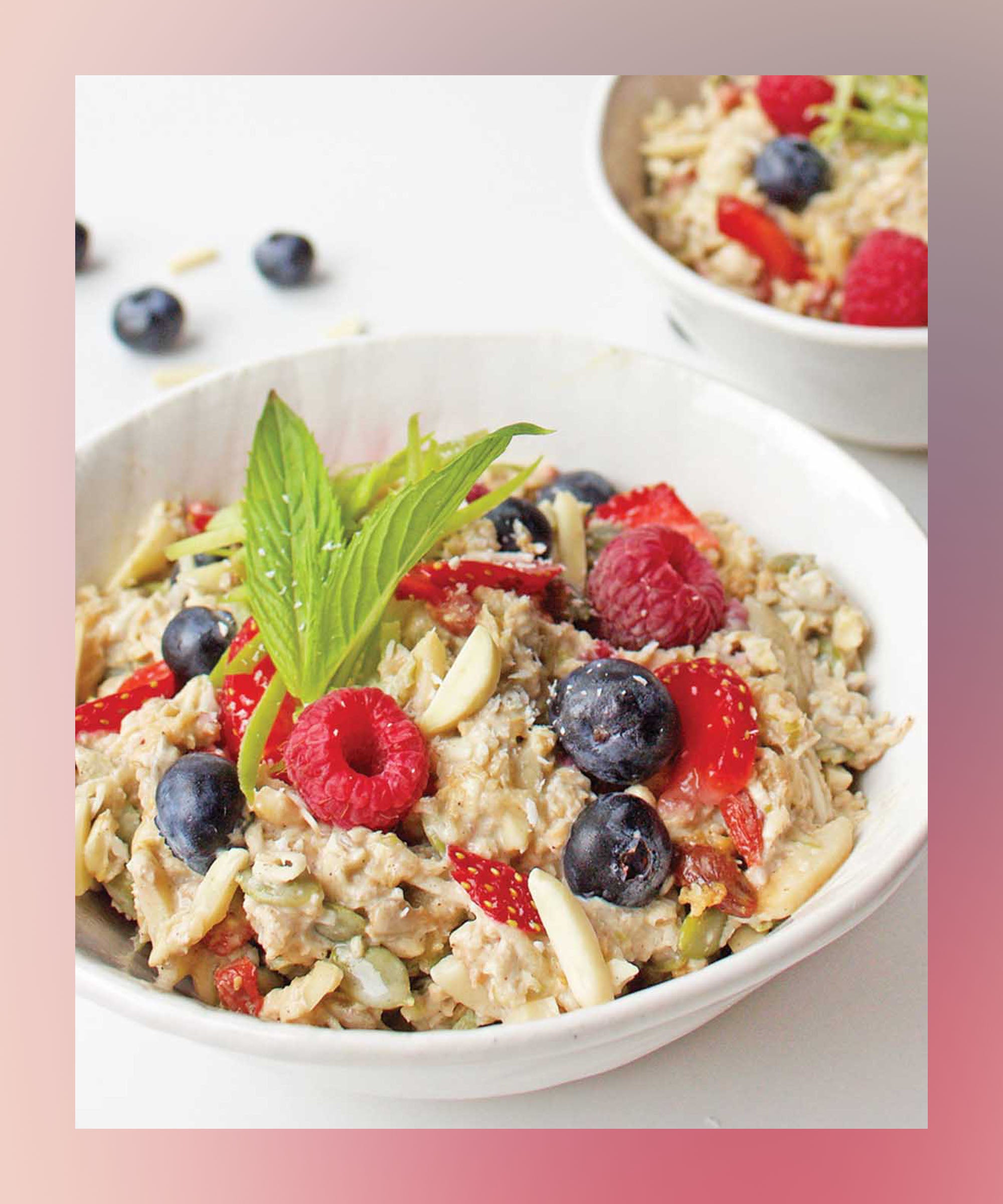 1) Place the oats, chia seeds and 2 cups of water, almond, or coconut milk in a bowl. Allow to soak overnight.