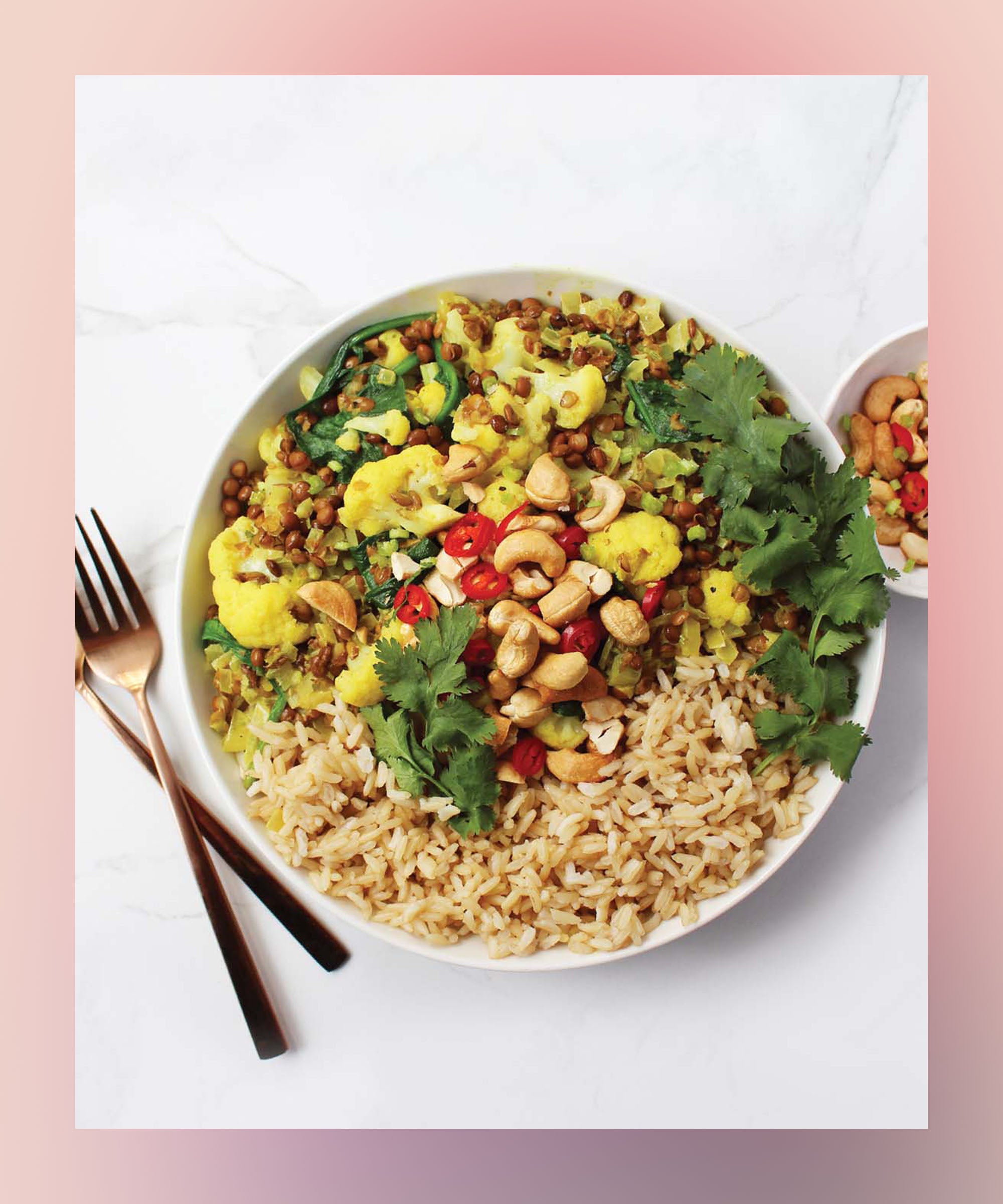 2) Add the cauliflower and stir to coat in the curry spice mix. Allow to brown for 2 to 3 minutes as you pour in the lentils, coconut milk, and water or stock. Season to taste.