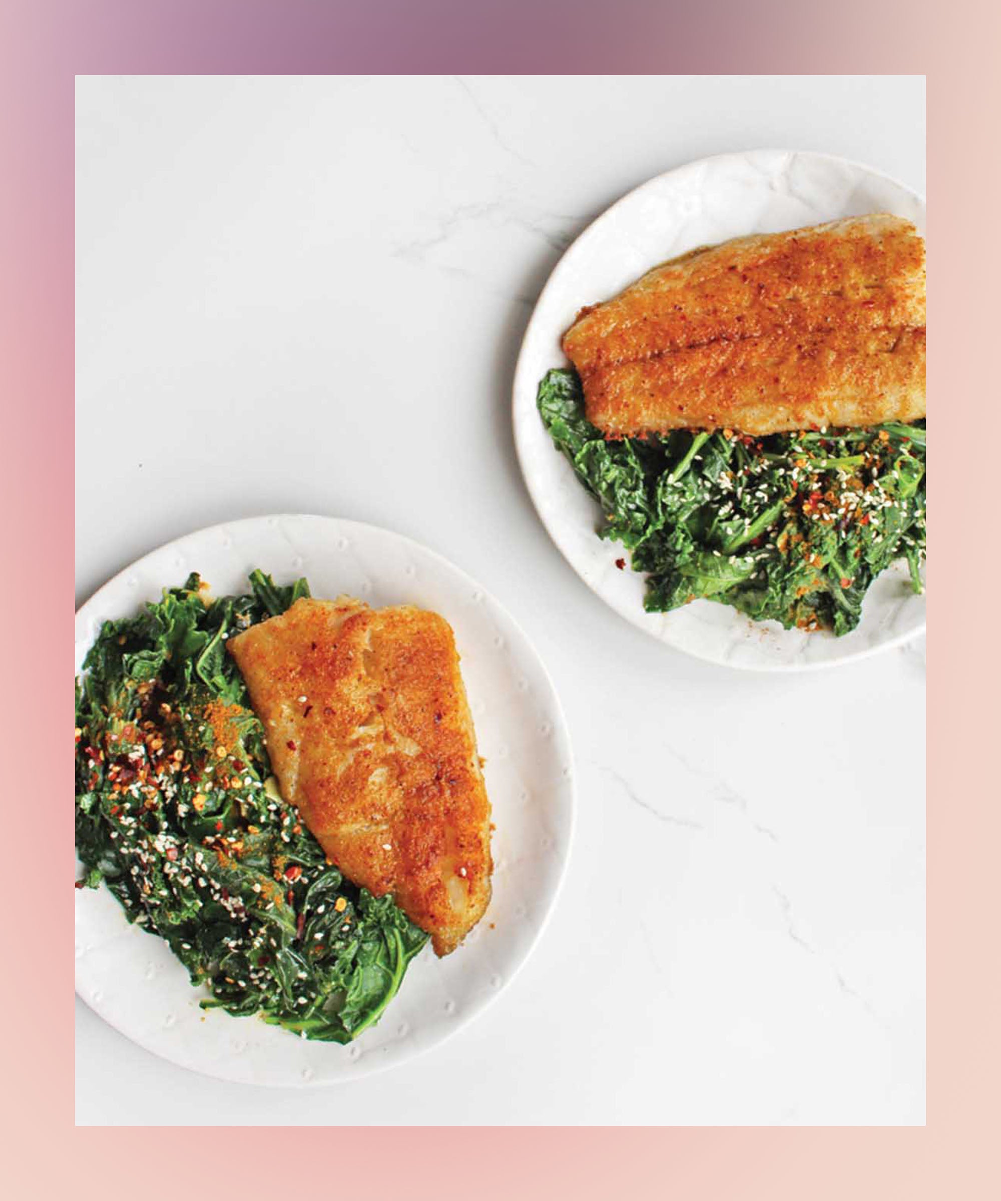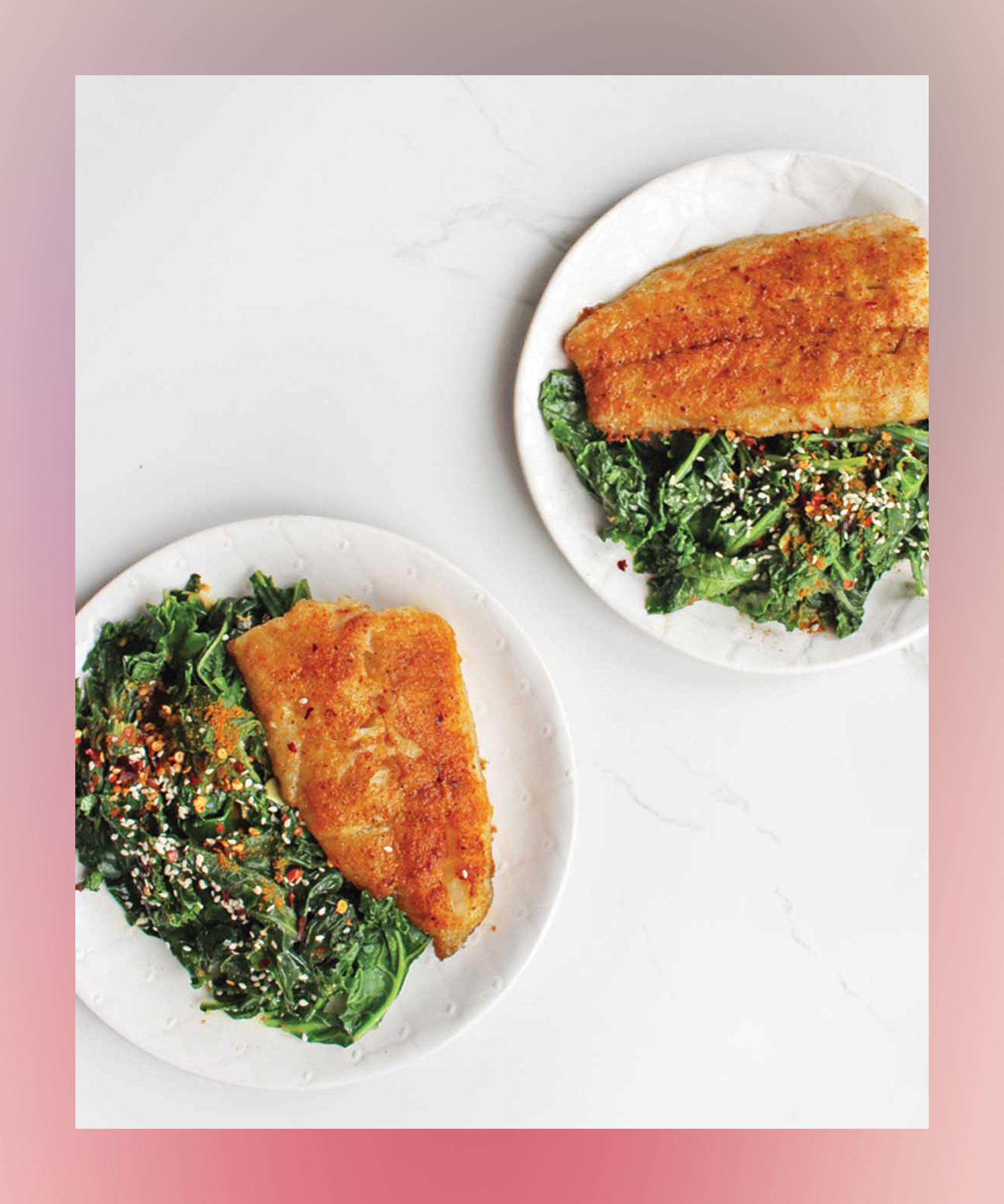 6) Serve the fish fillets with the kale, optional brown rice and a sprinkle of chili flakes.