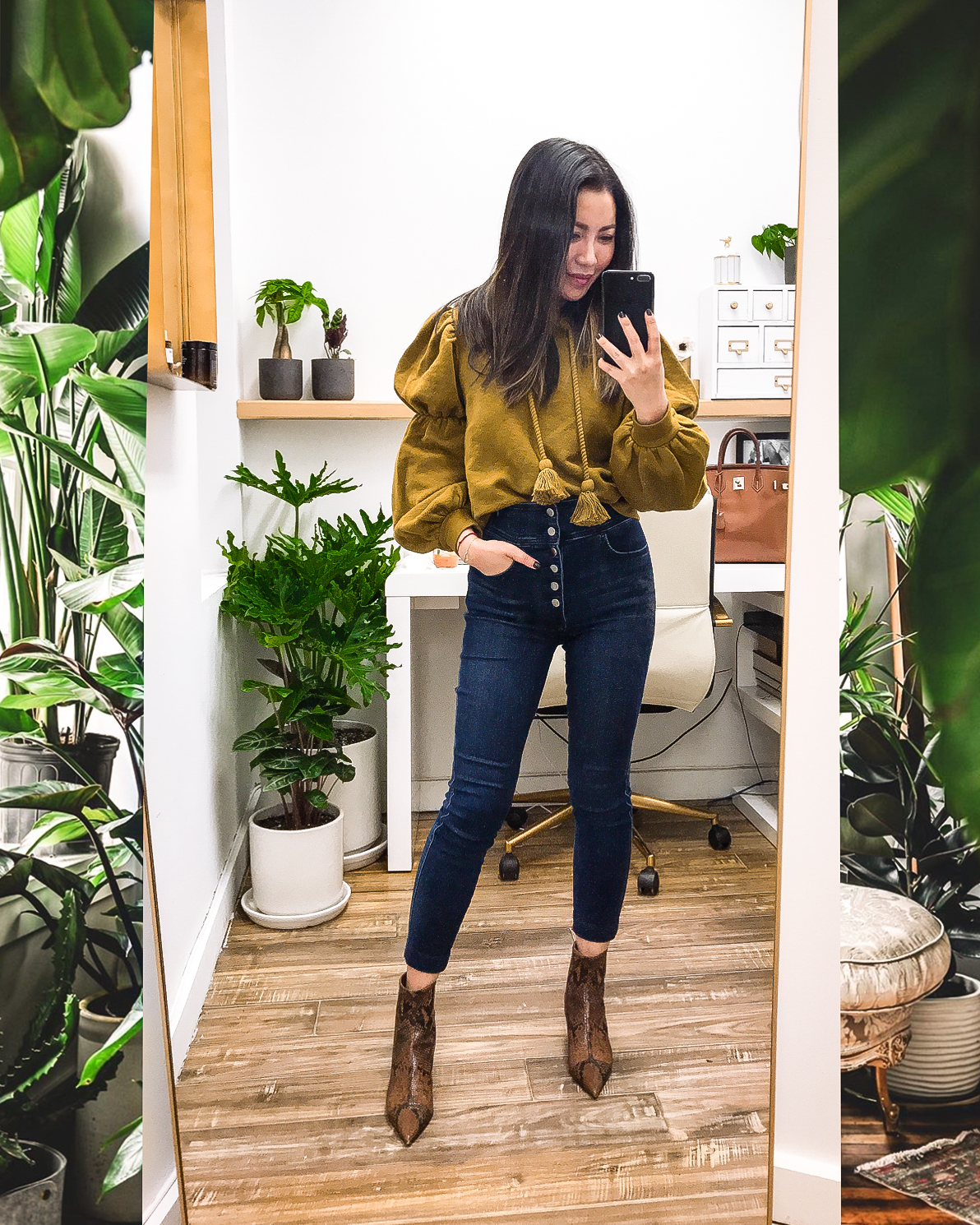 When it comes to work outfits, as you can see, high waisted jeans are my favorite. They’re extremely slimming and help elongate our legs. Here are a few more of my favorites: Madewell button front dark high waisted jeans, Topshop high waisted jeans, and Everlane stretch button fly high waisted jeans.