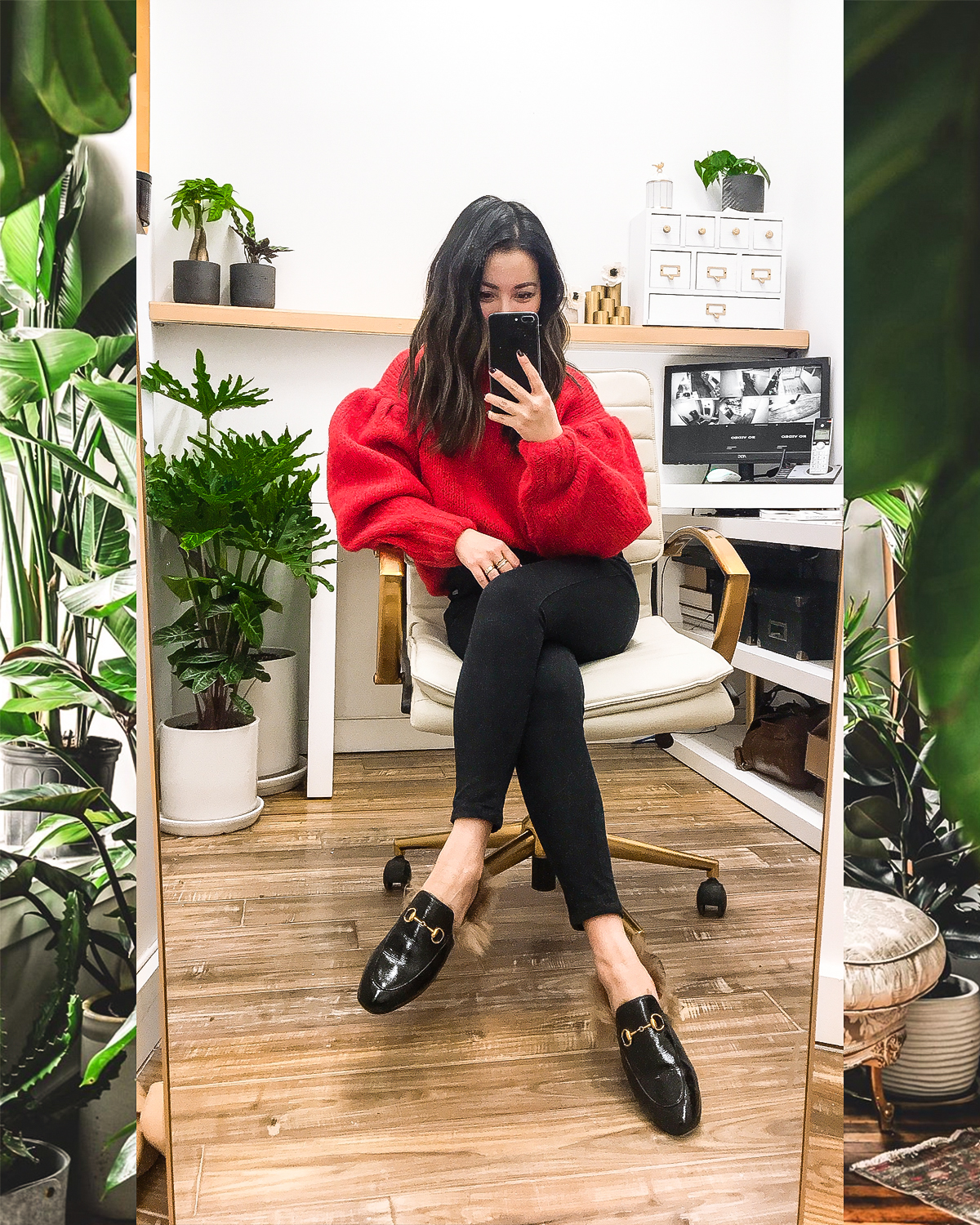 My secret to keeping my feet happy and not too sore is applying a CBD balm (will talk about that later) and switch to comfy loafers by the end of the day. These shearling loafers definitely live up to the hype – they’re suuuuper comfortable! If you like the look of these, I found a few more options at great prices – Steve Madden faux fur loafers (under $75) and Franco Sarto faux fur slides (under $75).