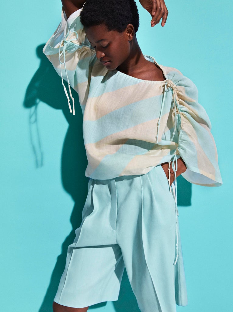 Like many of the collections unveiled this week, the Studio collection is moving toward a more sustainable future, based on the work H&M has already accomplished when it comes to developing and using sustainable materials. According to Wikell, the Studio collection uses organic cotton and recycled polyester, fabrics that were first introduced in its Conscious Exclusive collections. “By the end of the year, 100% of our cotton will be organic, recycled, or obtained via the Better Cotton Initiative (BCI),” she explained, mentioning how the company is on target to hit one of its ambitious sustainability goals.