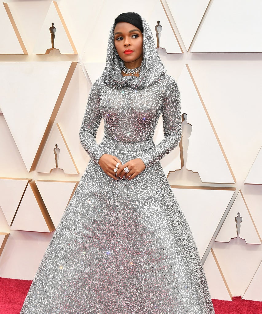 Little red riding who? Janelle Monae, the ultimate multi-hyphenate and a 2020 Academy Awards performer, appeared on the Oscars’ red carpet in a matching head-to-toe sequin look. Wearing a body-hugging long-sleeve top with a hood and an open back, along with a matching voluminous skirt, Janelle topped off the look with three sparkly rings and a twinkling tiered choker. We are extremely here for hoods on the Oscars red carpet — especially if they’re completely bedazzled.