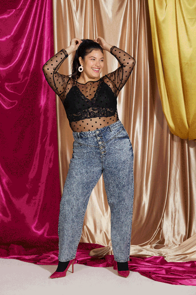 A sheer, Swiss-dot bodysuit presents as much opportunity as it does bafflement: What do you even wear underneath? The optimal solution is a longline crochet lace bralette. For one, it doesn’t obstruct so much as add to the overall effect with its open-weave composition and double adjustable straps that meet in a crisscross at the back (that’s texture and visual interest handily taken care of). For another, a monochromatic upper half allows for even more fun elsewhere, i.e. acid-wash denim and a fuchsia point-toe pump, which, altogether, make for a going-out look that’s so much more than a nice top and jeans.