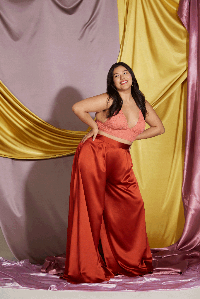 We’re starting out strong with a nighttime ensemble you can build up to — or down, rather. A standalone-worthy, ribcage-covering silhouette makes this smocked bralette work as Real Clothing, while the tone-on-tone pairing with burnt orange palazzo pants creates a cohesive color story. (Pro tip: The adjustable-strap bralette comes in loads of shades, so finding one that suits you and your preferred trouser situation won’t be an issue. Bonus points if you swap out the voluminous pant for a ball skirt, too.) Evening dressing really can be as simple as letting your innerwear have a big night out — don’t let anyone tell you otherwise.