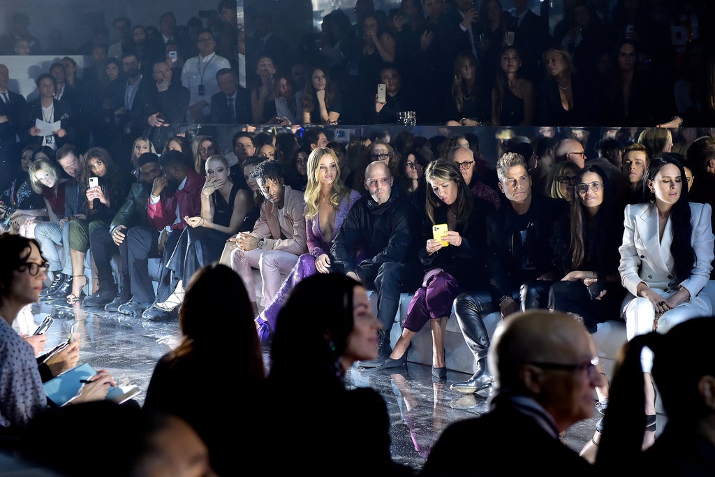 Last Friday evening, one in-demand model after the next walked — or, more accurately, floated — down a mirrored runway to a remix of The Pointer Sisters’s hit “I’m So Excited.” The show was Tom Ford, and “excited” was undoubtedly the mood at his highly anticipated event that was bursting at the seams with glamour: Supermodels-turned-superheros donned vibrant, cape-like tops that cascaded over fitted sweatpants; an otherworldly Bella Hadid, hair slicked back, opened the evening-wear portion of the night in a glittering sheer gown with Kendall Jenner not far behind in an equally transparent, lace iteration of the same silhouette. This epic spectacle was running on the star power in the room as attendees like Jennifer Lopez, Tracee Ellis Ross, and Jeff Bezos (yes, you read that last one correctly) looked on.