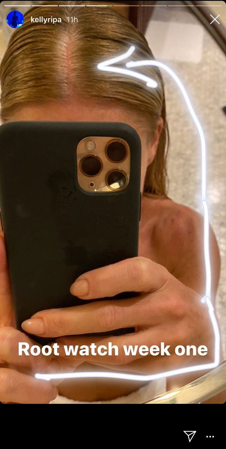 Kelly Ripa posted a clip of her "root watch" on Instagram Stories showing her silver roots coming in. We're looking forward to seeing how her hair color progresses as the weeks go by. Photo courtesy of Instagram user Kelly Ripa.