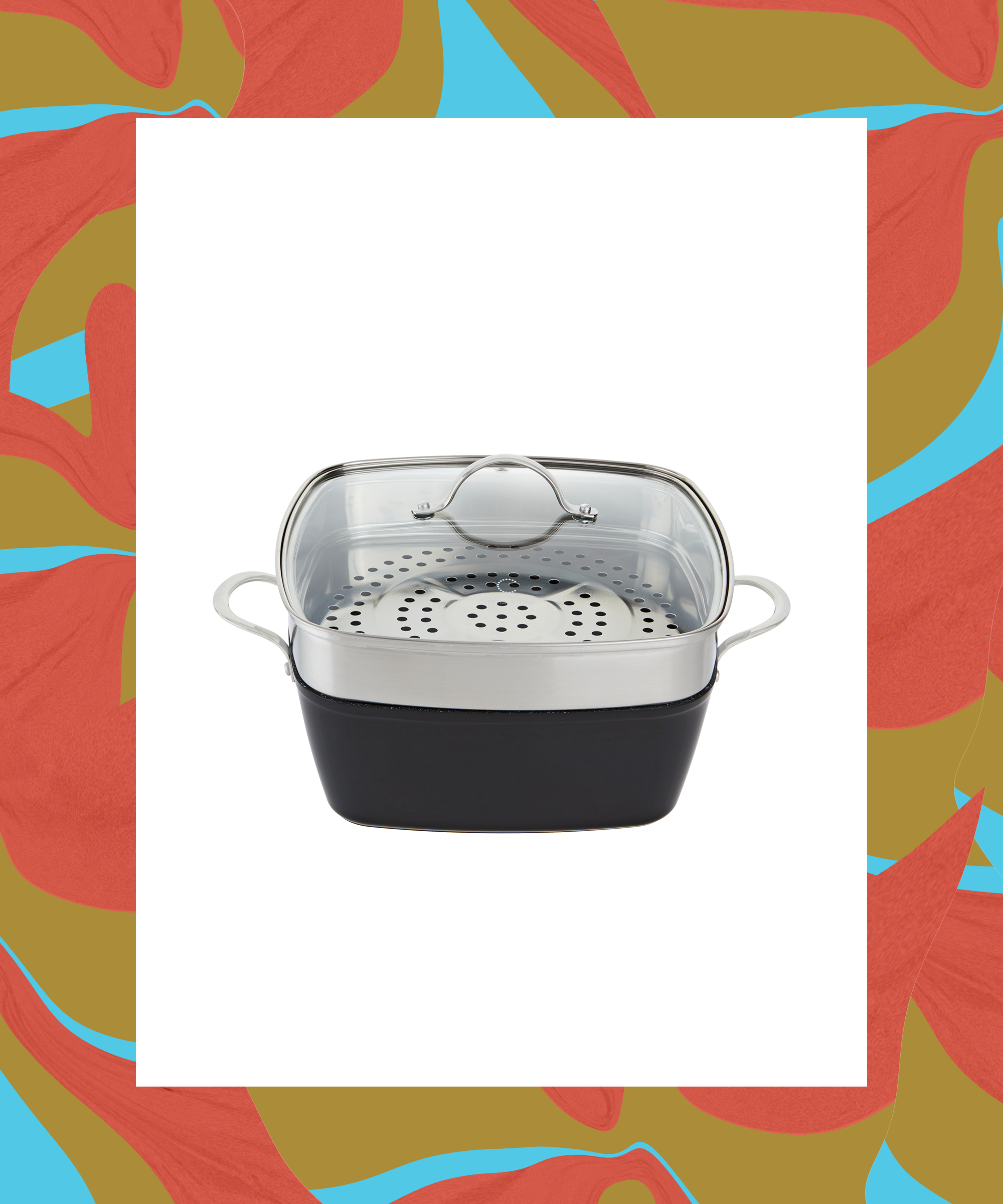 The only sauté set you'll ever need: fryer, baking dish, roaster, sauté pan, stock pot, and steamer in one.