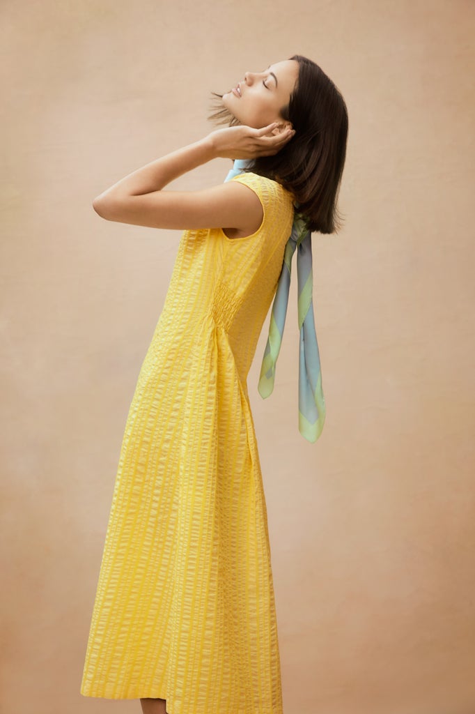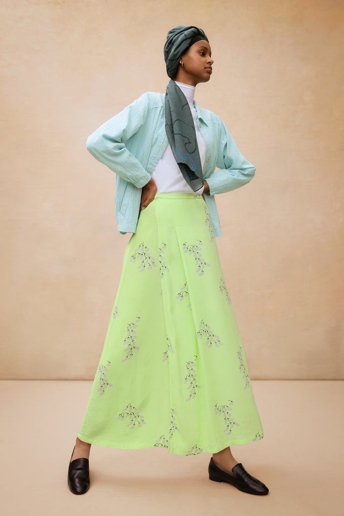 The collection goes on to feature bright colors and original patterns drawn by Tajima herself. “I wanted this collection to feel joyful. To bring a sense of play back into the way we dress,” she recalls. The result: a 36-piece collection of flowing house dresses (perfect for staying inside right now), blouses, outerwear, and modest accessories that any woman, no matter her reason for dressing, could style comfortably this spring.