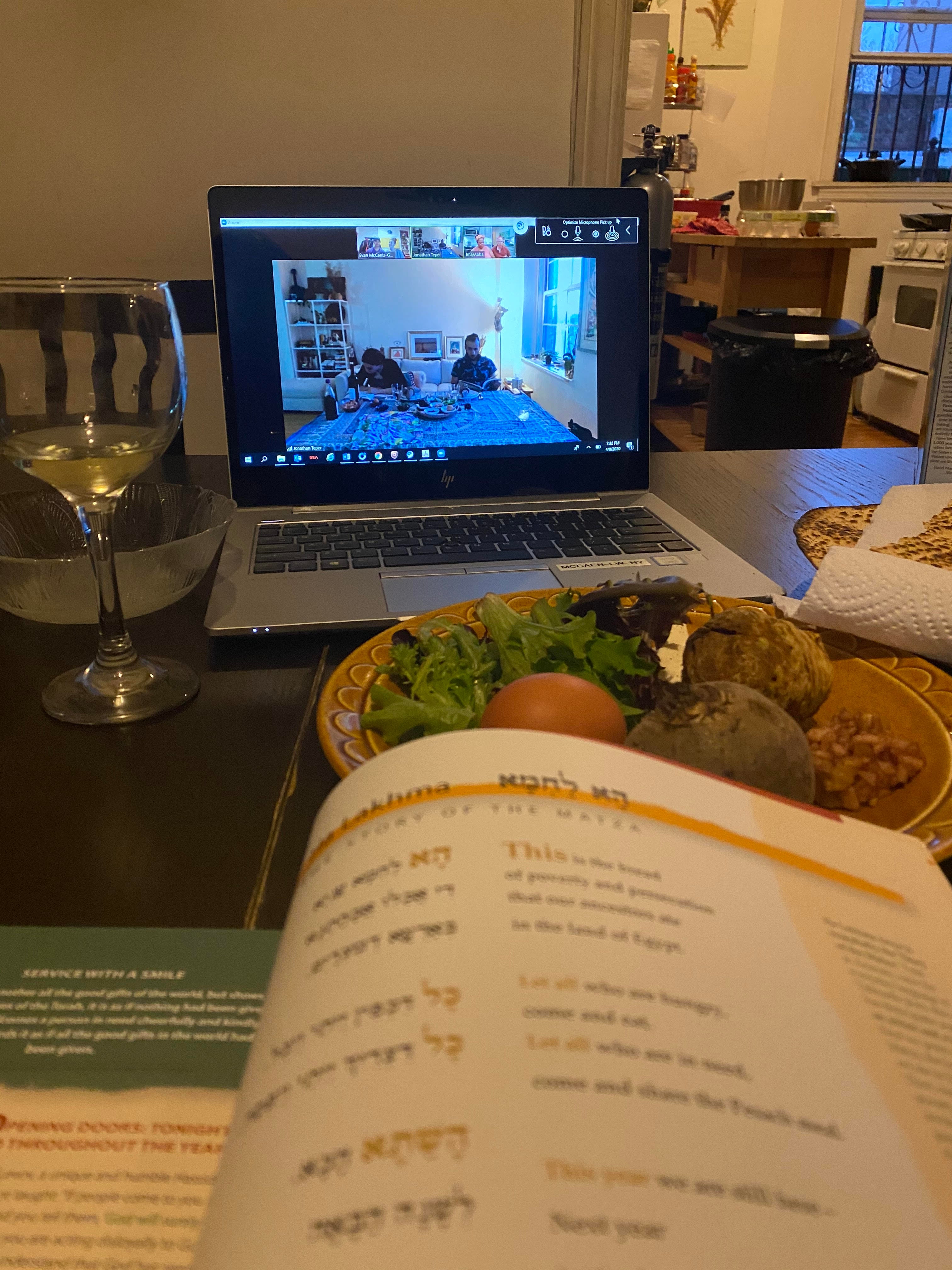 Caitlin: "I'm doing Zoom seders with both Jake's family and my own: His last night, mine tonight. My family tends to be very meal-focused and speed through the haggadah ("Time for the festive meal!") so it should be interesting for us."