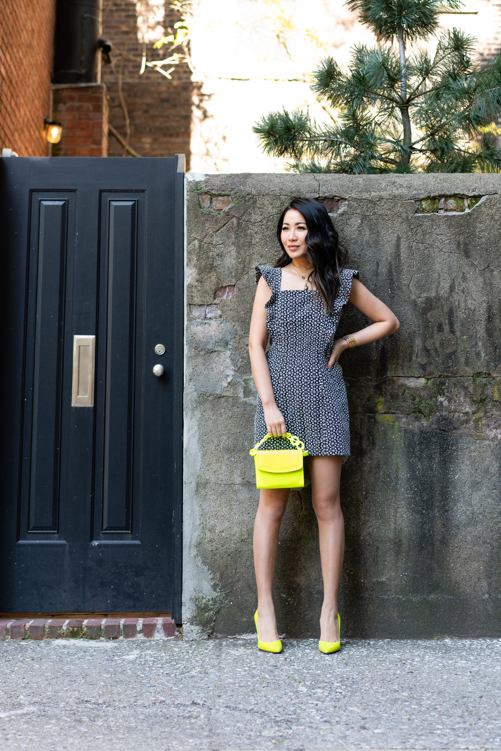 One of my favorite ways to wear neon accessories is to pair them with neutral pieces. This Scoop ruffle dress is simple yet darling. I really love how the sharpness of the square neckline is juxtaposed with the softness of the ruffles. And the black and white print motif creates a beautiful canvas to highlight the pops of neon.