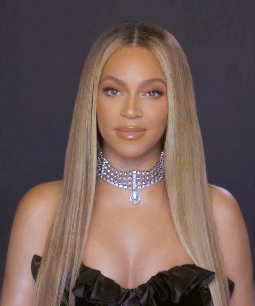 Shortly after, Beyoncé emerged on-screen to deliver her speech shortly thereafter, with her typically glowing skin, makeup, and hair looking impeccable. The star has been rocking her blonde for years, but her color looked much brighter toward the roots, with platinum pieces framing her face. The center-parted style created by Nakia Collins (paired with her diamond choker) was nostalgic in its own way, giving us flashbacks to Bey’s “Bootylicious” music video.
