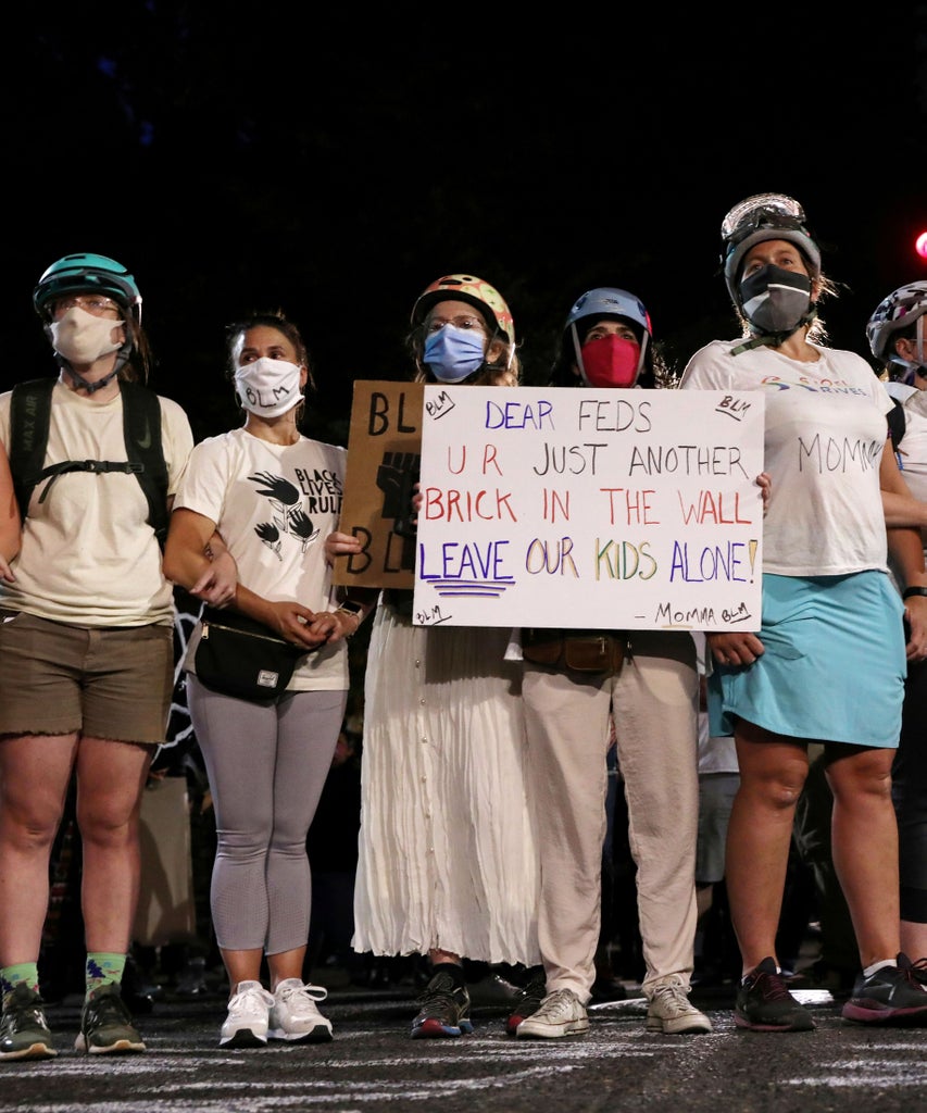 Now-viral videos taken outside the city’s federal courthouse show the moms, dressed in white and decked out in protective bike helmets, chanting “Feds stay clear! Moms are here!” and “Leave our kids alone.” According to Buzzfeed News, the moms remained at the scene for hours until officers eventually deployed tear gas and used flash bangs to disperse the nearly 400 person crowd.