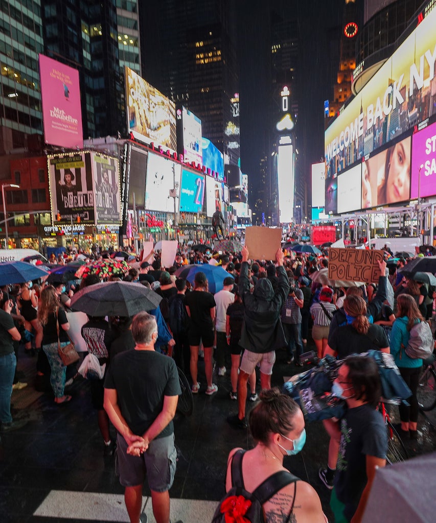 Protestors were gathered in Times Square to honor Prude after his family released body camera footage of his death in March. When he was arrested, Daniel Prude had just been released from the hospital for suicidal ideation. His brother Joe had called the police worried that he was having a psychotic break. The graphic video shows officers putting a spit hood over his head before pressing him into the ground as he lay on the street naked and handcuffed.