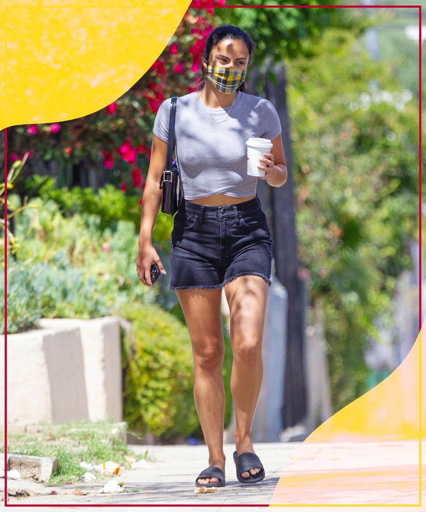 Riverdale star Camila Mendes was the first to kick-start this trend when, over the summer, she showcased a yellow-and-black plaid mask courtesy of NY-based sustainable brand Collina Strada. Mendes went on to wear the mask a number of times throughout July and August, which she paired with black, high-waisted jeans and a grungy Saint Laurent T-shirt during a grocery store run and cropped T-shirts with cut-offs while grabbing coffee.