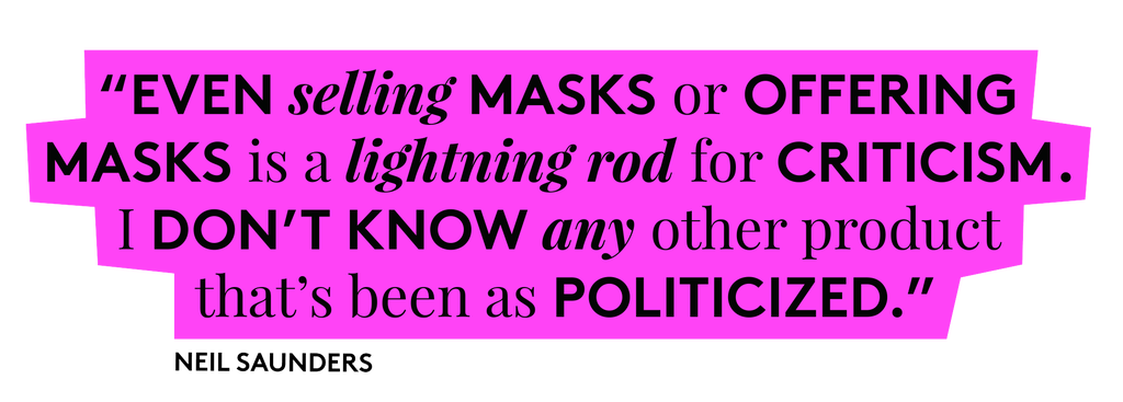 Designers and retailers have a responsibility to get it right — and quickly — which Saunders points out is key to retailers establishing masks as a more permanent fashion category. “What you don’t want [as a retailer] is to offer masks that people buy on the basis that they’re going to be protected, and they somehow find out that your masks do a lousy job at protecting people,” he says. “That’s very, very important.”
