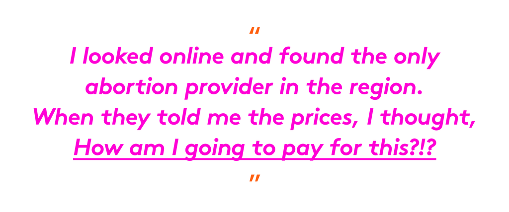 I looked online and found the only abortion provider in the region, located about an hour away in McAllen. I called and when they told me the prices, I thought, How am I going to pay for this?!?