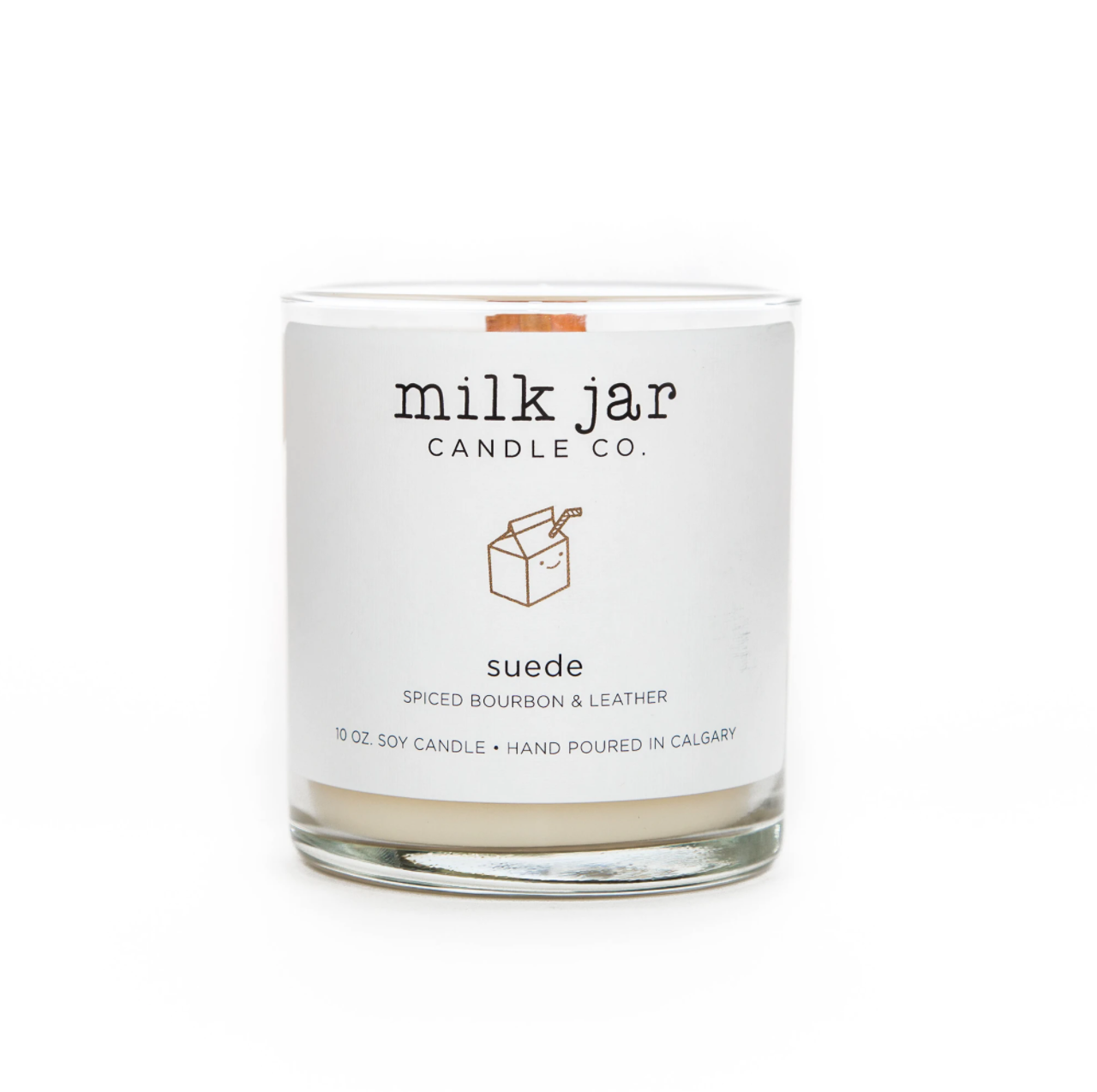Milk Jar Candle Co Suede, Bourbon & Leather, $, available at Icon Hair & Body