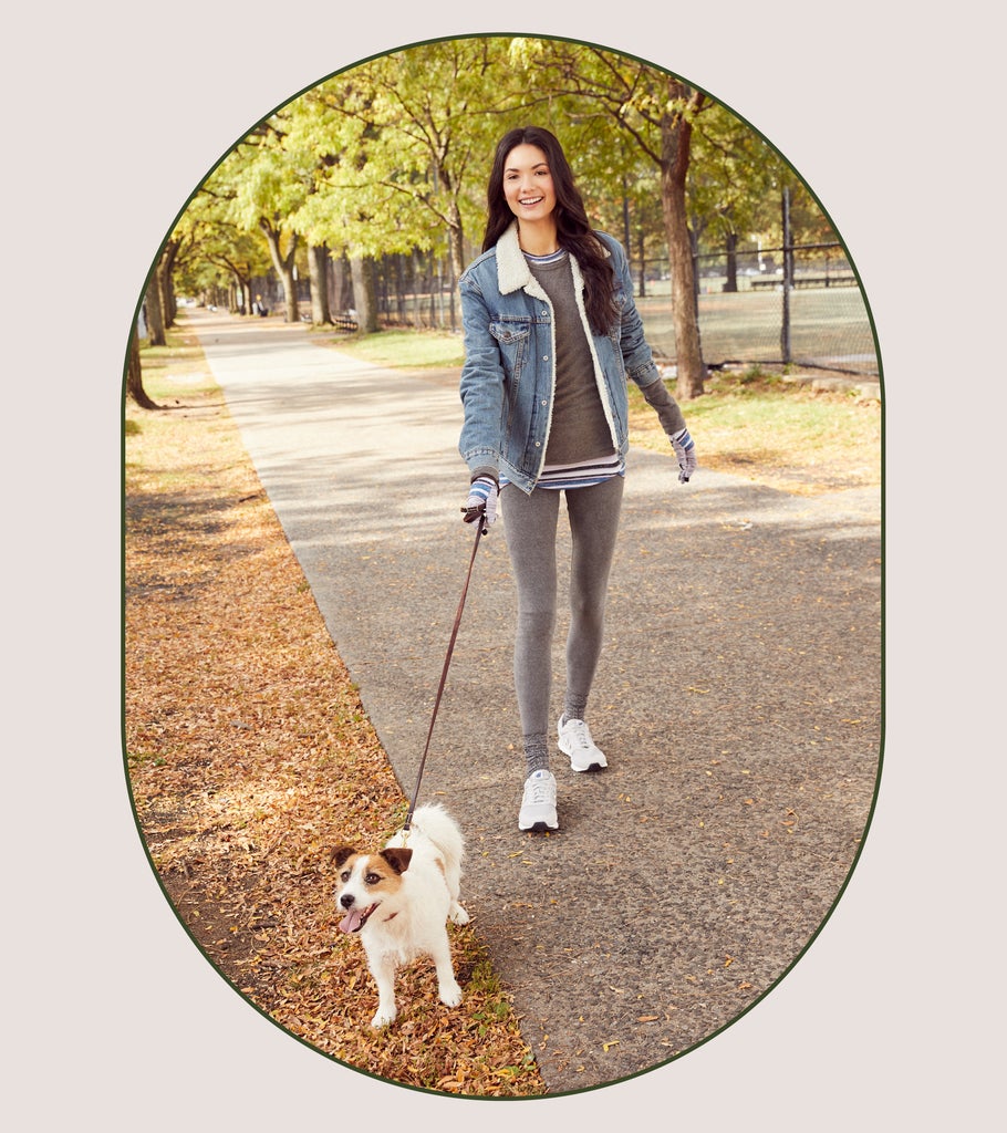 For outside: Break up the gray with a striped top (thumbholes make it even easier for layering) and shrug on a shearling-lined denim jacket for an extra layer against chilly breezes — necessary when you’re freezing because your dog is taking her sweet time sniffing trees.
