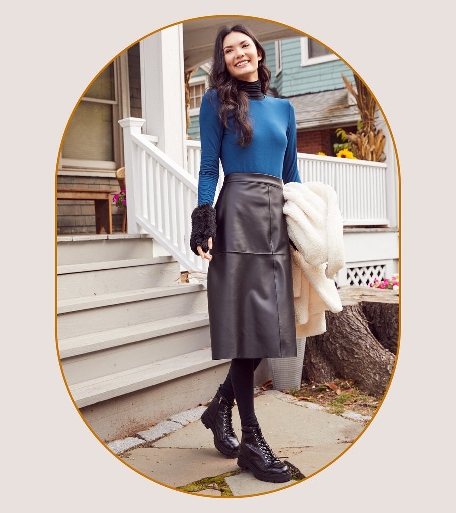 For outside: Let’s say you lost track of time and you only have a few minutes before you’re meeting friends at an outdoor restaurant for dinner. Your outfit will take all of 30 seconds to put together: Slip on another layer (a teal for a pop of color) and a midi-length skirt, and throw on a coat and boots. Done.