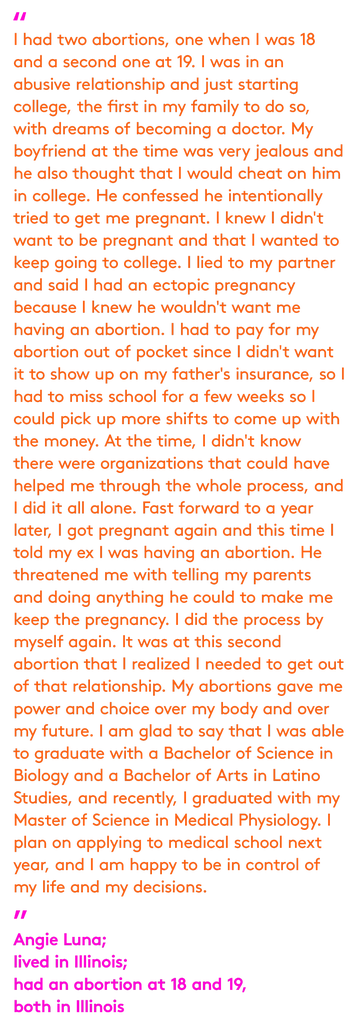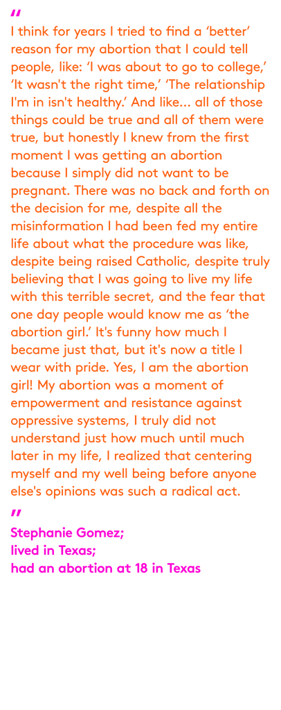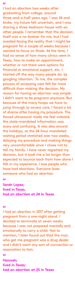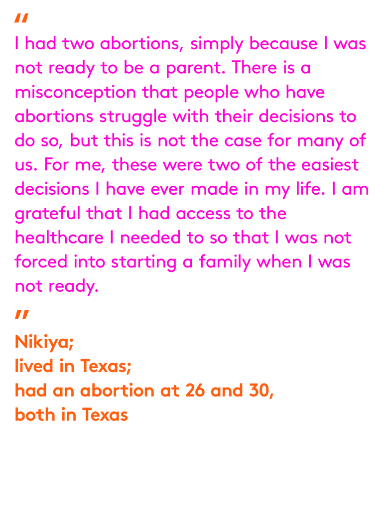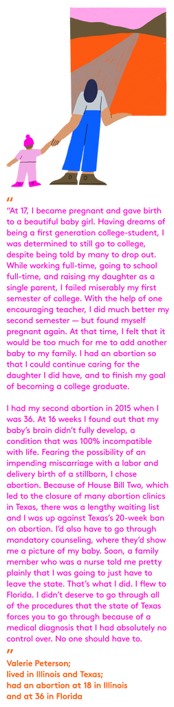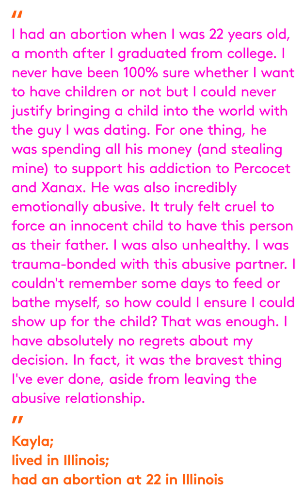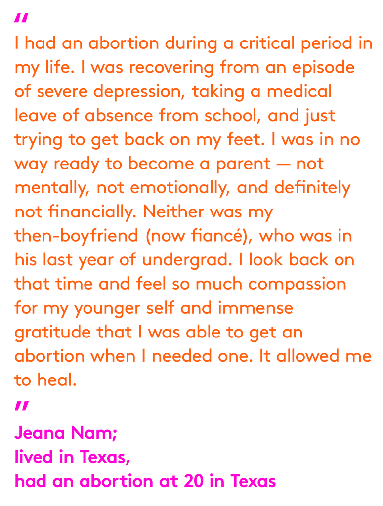 That’s one reason we decided to kick off our Access For All package by asking 21 people to explain, in their own words, why they chose to have an abortion. A diversity of abortion stories can help disprove the damaging myths that lead to abortion restrictions, and provide support to people who are seeking abortions, who may feel isolated, Bracey Sherman says.