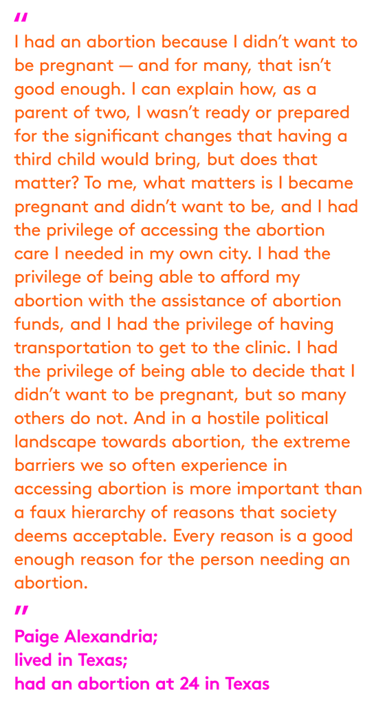 And yet, even within communities that ostensibly support the right to abortion, there exist pervasive and damaging stigmas against certain “types” of abortion. “We’ve found that when people share their abortion stories, they often hear: ‘Well I’m pro-choice, but — I think you waited too long.’ ‘I think you had too many.’ ‘You didn’t use birth control’,” says Renee Bracey Sherman, a reproductive justice activist, author of Saying Abortion Aloud, and executive director of We Testify.