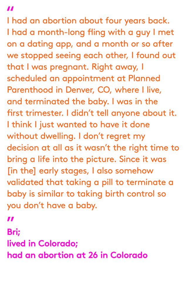 But, she adds, she wishes people didn’t have to divulge the details of an intimate personal decision for people “to think that we’re worthy of autonomy and access to healthcare.” As Bracey Sherman puts it: “Abortion stigma impacts all of us. Some more than others.”