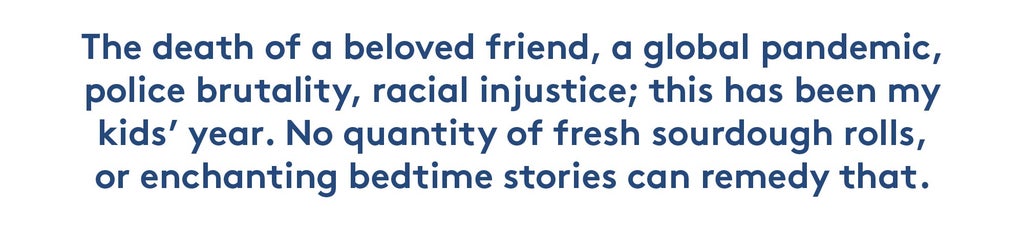 The death of a beloved friend, a global pandemic, police brutality, racial injustice; this has been my kids’ year. No quantity of fresh sourdough rolls, or enchanting bedtime stories can remedy that. The losses are enormous, and the grief continues to reverberate. Each day, I try my best to comfort them.