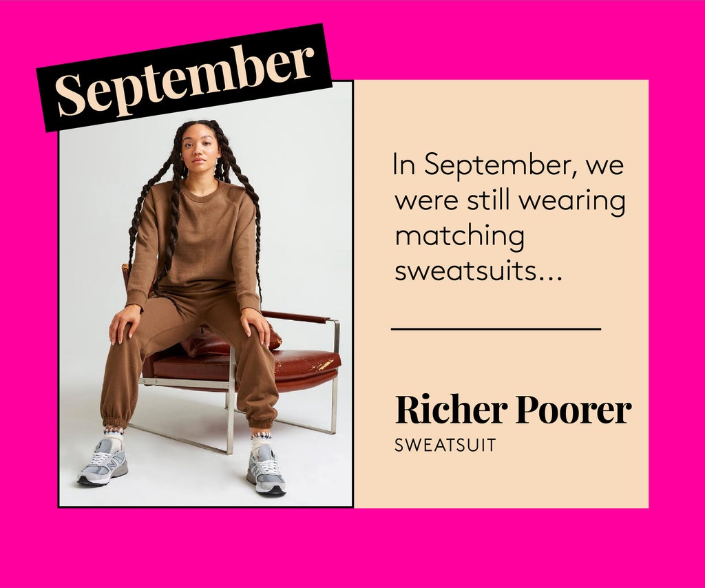 Although the year of sweatsuits technically began when the pandemic first hit, September marked a notable turning point in which the weather got cooler and our 2020 vision of the new clothing investment came into sharp focus. By this point in time, the “Stay-At Home Wadrobe” had been solidified as soft-and-easy loungewear we could don from morning through night on repeat all week and weekend long. We covered all 360 degrees of loungewear, from the most polished options to crowdsourced outfit inspiration and even every brand’s loungewear revolution that occurred during the 12-month span. In total, nearly 2,000 matching sweatsuits were purchased along with 900 knit loungewear sets. We’d call that one comfy year.