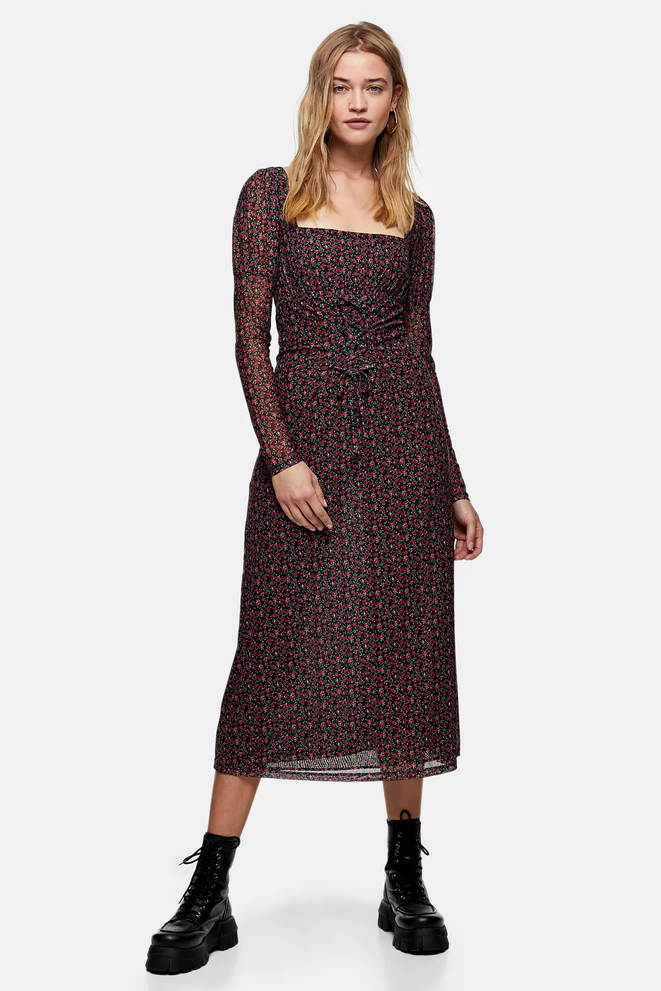 Topshop Red Rose Print Lace Long Sleeve Midi Dress, $, available at Topshop