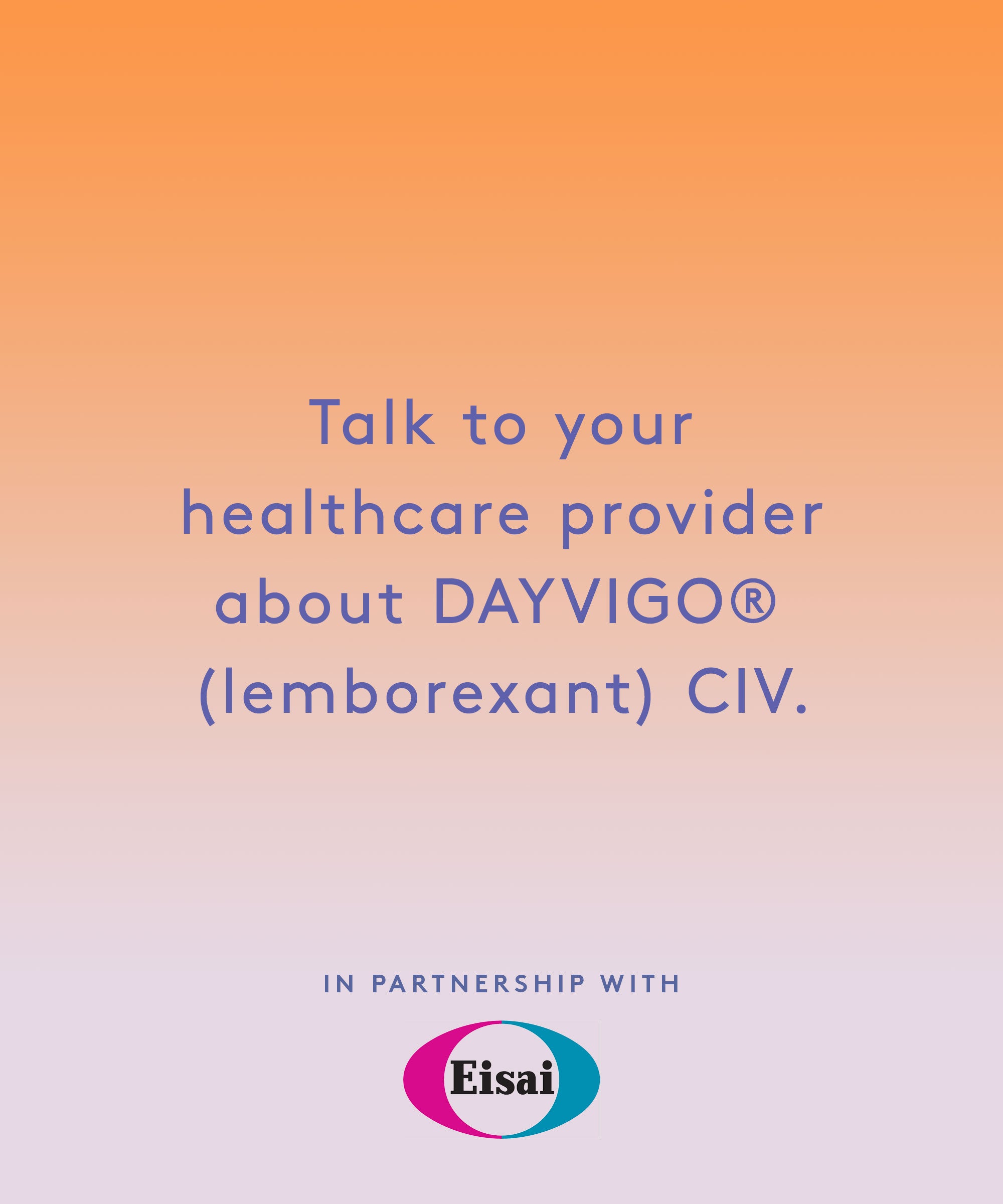 DAYVIGO is a prescription medicine for adults age 18 years and older who have trouble falling or staying asleep (insomnia). Do not take DAYVIGO if you fall asleep often at unexpected times (narcolepsy). Please see additional Important Safety Information included on the previous slide. Please also see Medication Guide for DAYVIGO.