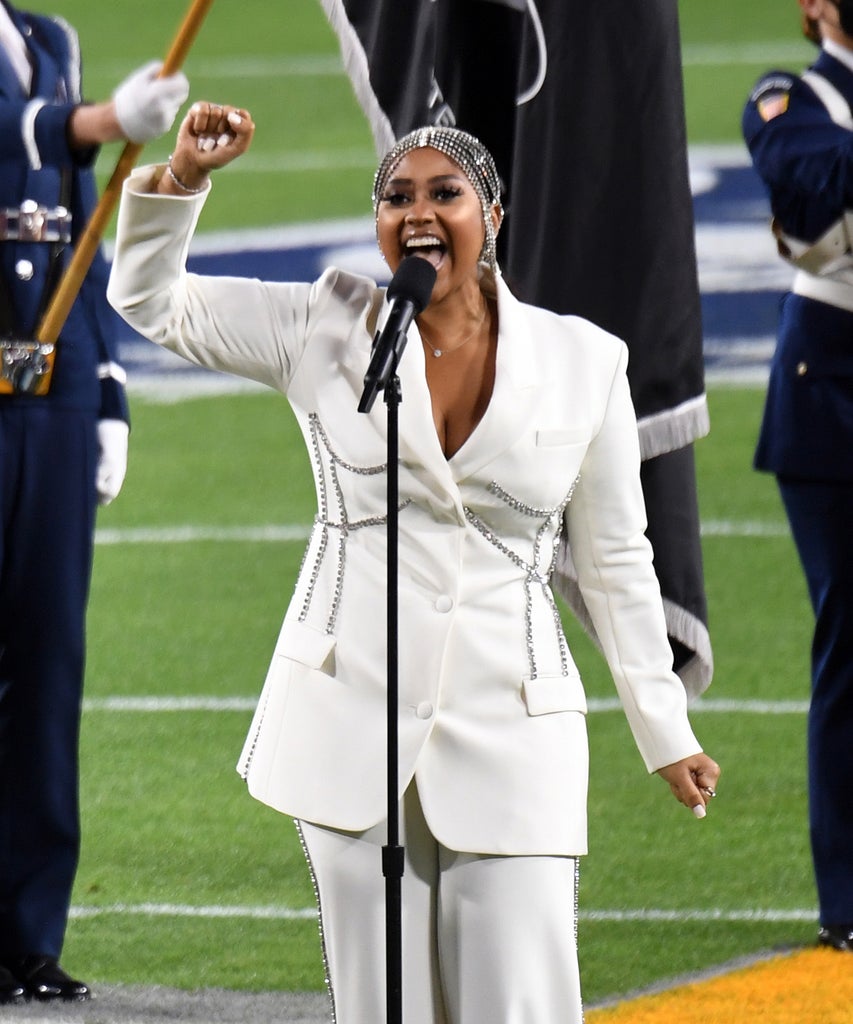 For last night’s Super Bowl, Jazmine Sullivan performed her rendition of “The Star-Spangled Banner,” accompanied by country singer Eric Church. The Grammy-nominated artist stepped onto the field in a gorgeous white tailored suit, but the pièce de résistance was her crystal hairpiece.