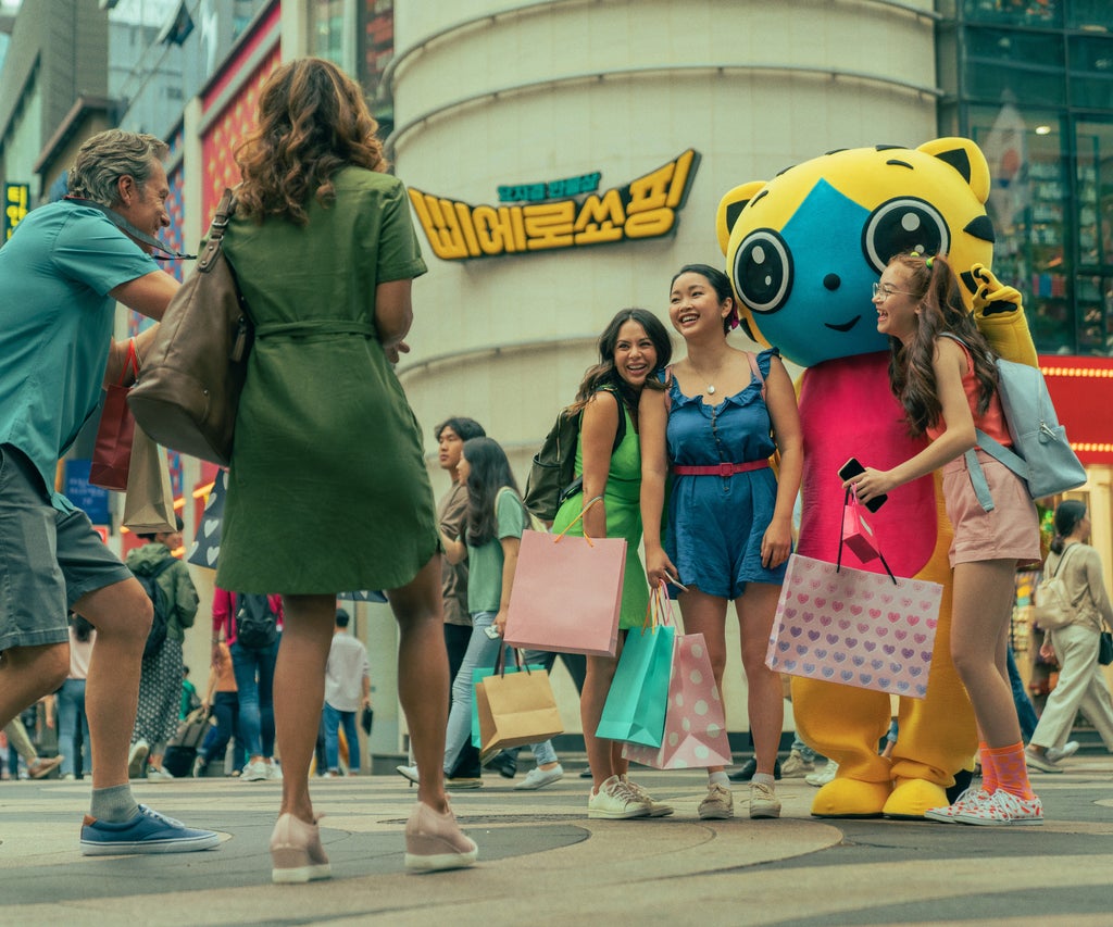 The movie opens with a Covey family spring break vacation in Seoul. “South Korea was very colorful when we were there,” says the film’s costume designer Lorraine Carson, who went from the second installment straight into the third. With this in mind, she gave Lara Jean’s signature palette a bright, poppy, and energetic twist.