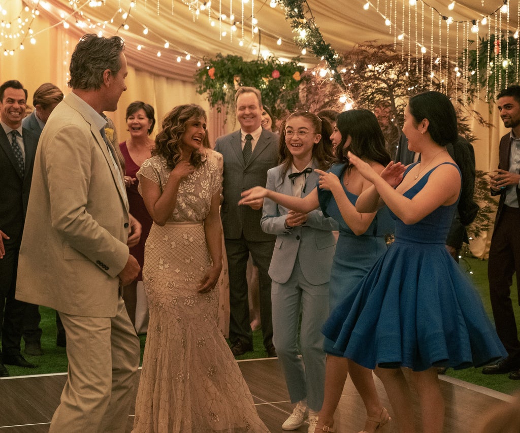 Lara Jean’s fashion culminates in the heartfelt nuptials of Dr. Covey (John Corbett) and chic neighbor Trina (Sarayu Blue), who conveniently chose the To All the Boys signature blue and pink as her wedding colors. Complementing the bride’s blush BHLDN dress, the Covey sisters wear a spectrum of blues — starting with Lara Jean’s again-customized fit-and-flare matte satin dress, coincidentally from a prom line, Leena for MacDuggal. Carson amplified the skirt silhouette with a structured, flouncy crinoline underneath and accessorized with pink Michael Kors stilettos. “It made her stand out,” she says.
