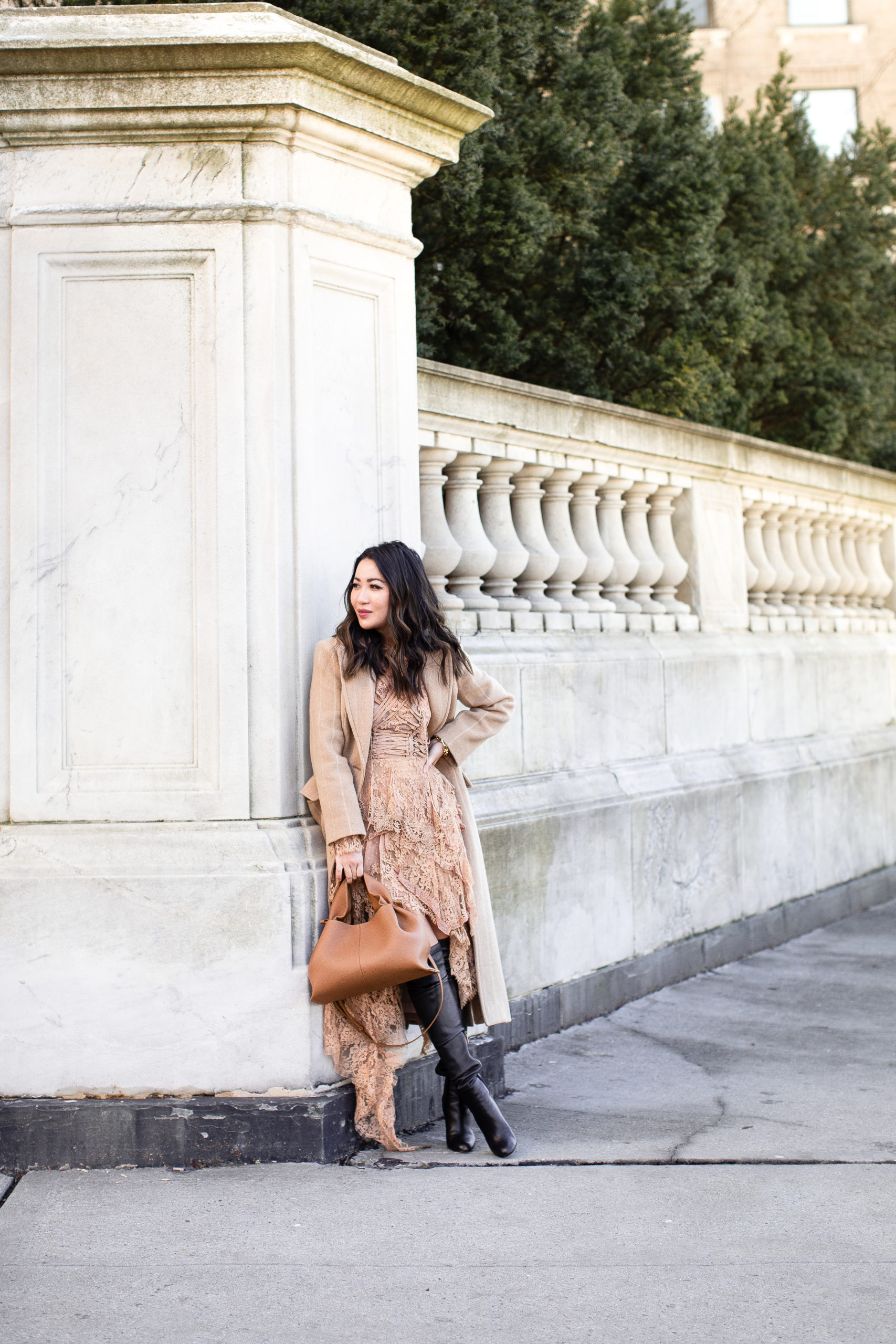 Today, we’re dressing up this coat (and I’ll restyle it again for a casual look soon) with lace in beige color stories to create a tonal look. Rounding out the look, I paired it with a deeper camel color with the bag.