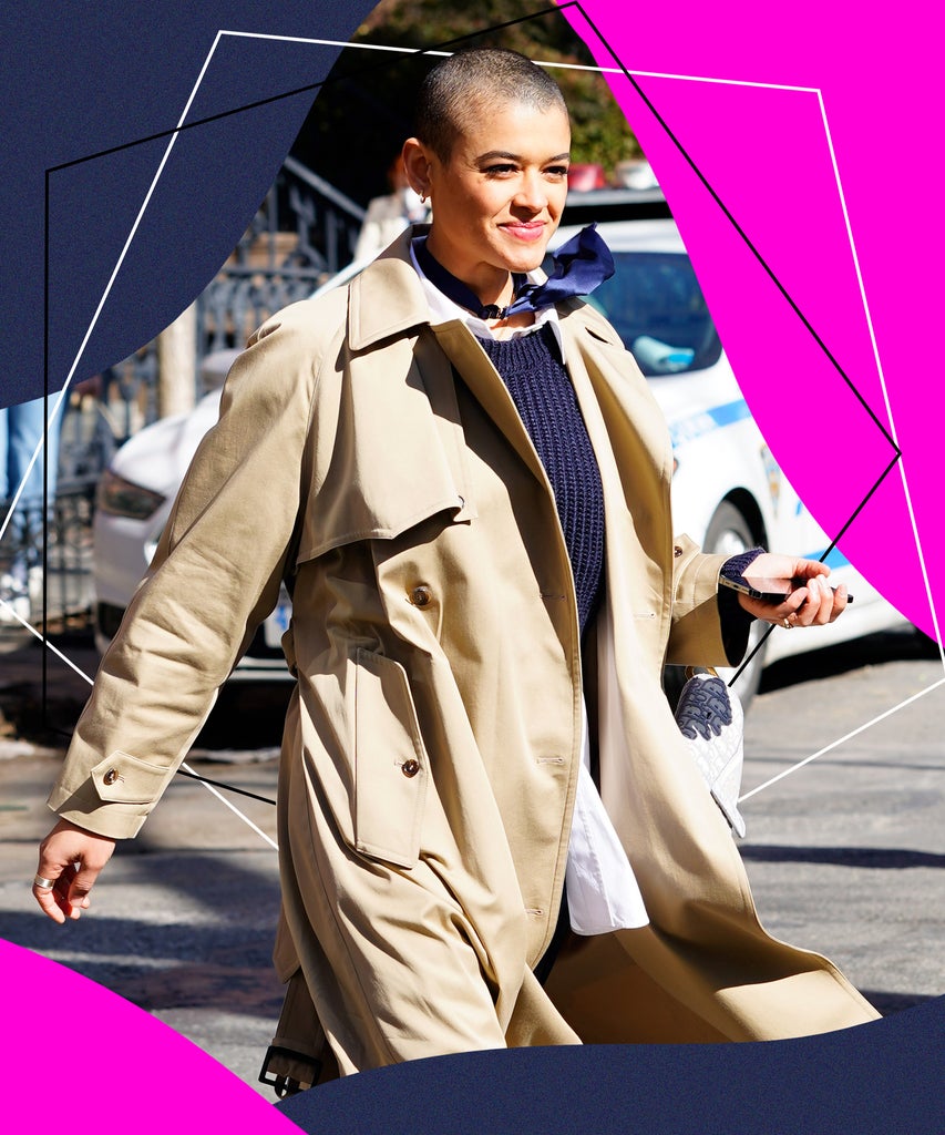 Like the outfits we’ve caught a glimpse of since filming began for the reboot — which included Schutz boots, Adidas sneakers, and bike shorts— Alexander’s latest, minus the designer handbag, is easy to recreate. Most people already own a trench coat, track pants, and sneakers. All we needed was Daman’s eye for styling to realize we should combine them all. And maybe add a tiny sweater for good measure.