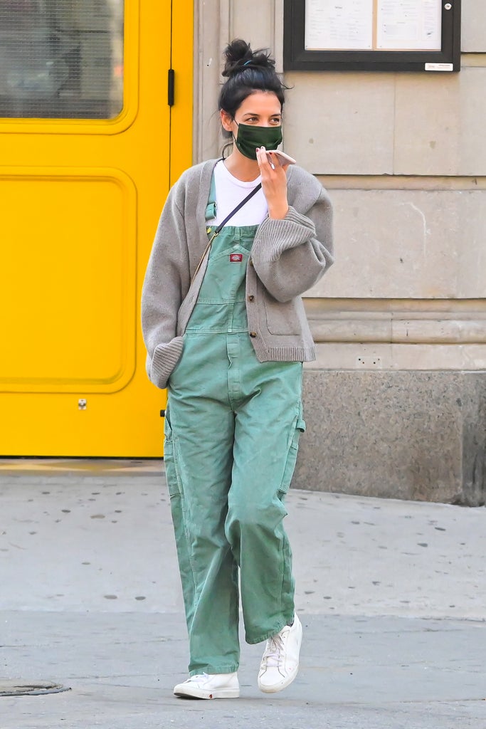 One day after digging up the perfect prairie dress — a keyhole Ulla Johnson frock that she paired with Common Projects sneakers — for spring’s (almost) debut, Katie Holmes is back again with another warm-weather look for us to covet and copy. On Thursday, the Dawson’s Creek star was seen walking in Lower Manhattan wearing a laid-back ensemble featuring her aforementioned Common Projects sneakers, moss green Dickie’s overalls, and a white T-shirt. For an added layer of warmth, she recycled a cashmere sweater. You might remember it from the time it went viral in August 2019.