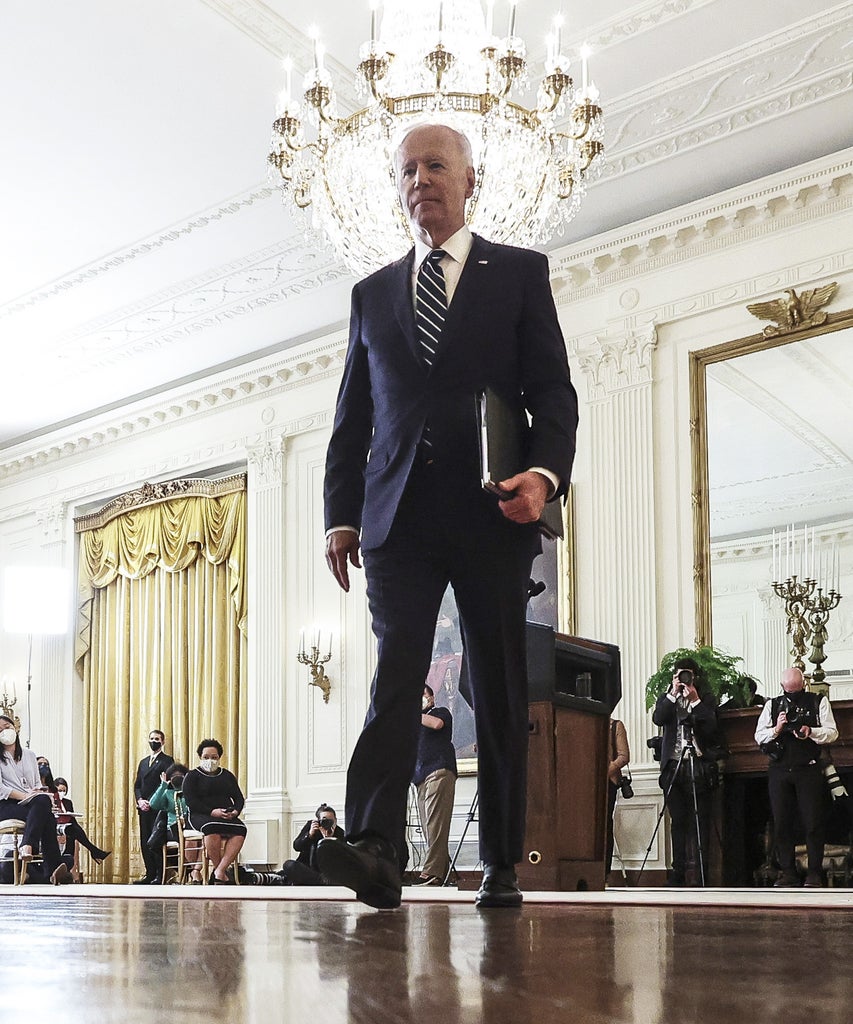 Since his first week in office, Biden has taken to sharing weekly slow-motion videos of himself, Harris, other politicians, and guests of the administration walking around the White House grounds with purpose. Usually, the videos are paired with captions like “51 days down” or “Another week in the books.” In a recent post for Equal Pay Day, he shared a clip of U.S. Women’s National Soccer Team athletes Megan Rapinoe and Margaret Purce strolling down a hallway side by side. “Equal Pay Day is a big deal around here,” he wrote. “Right, @mPinoe and @100purcent?”