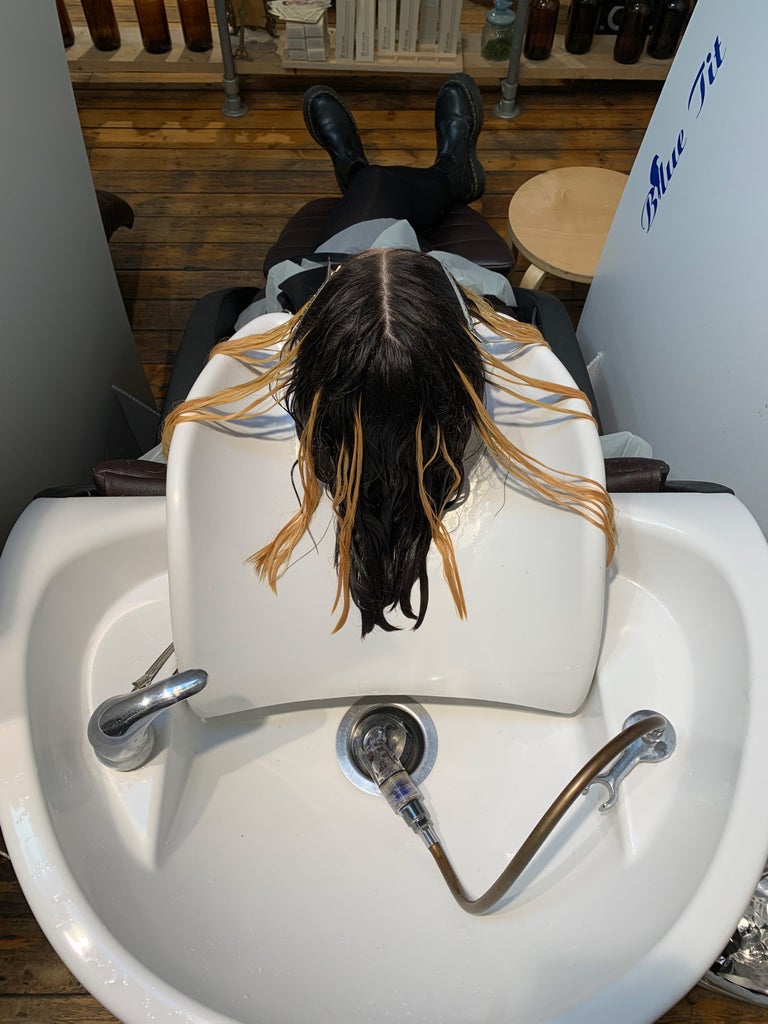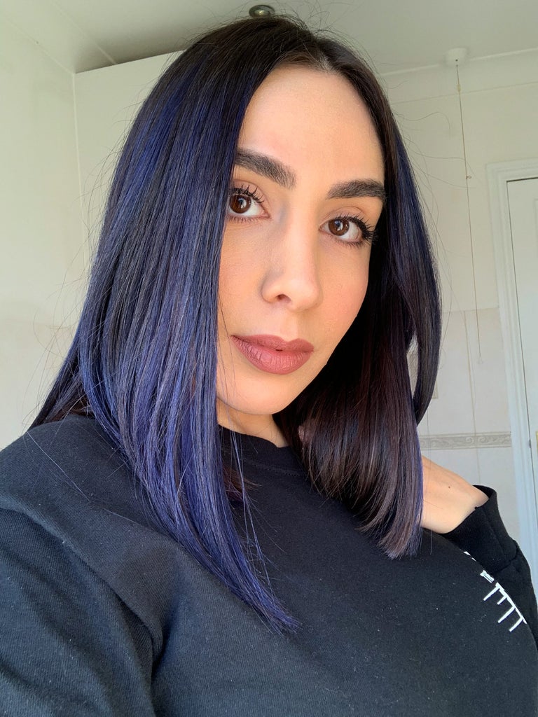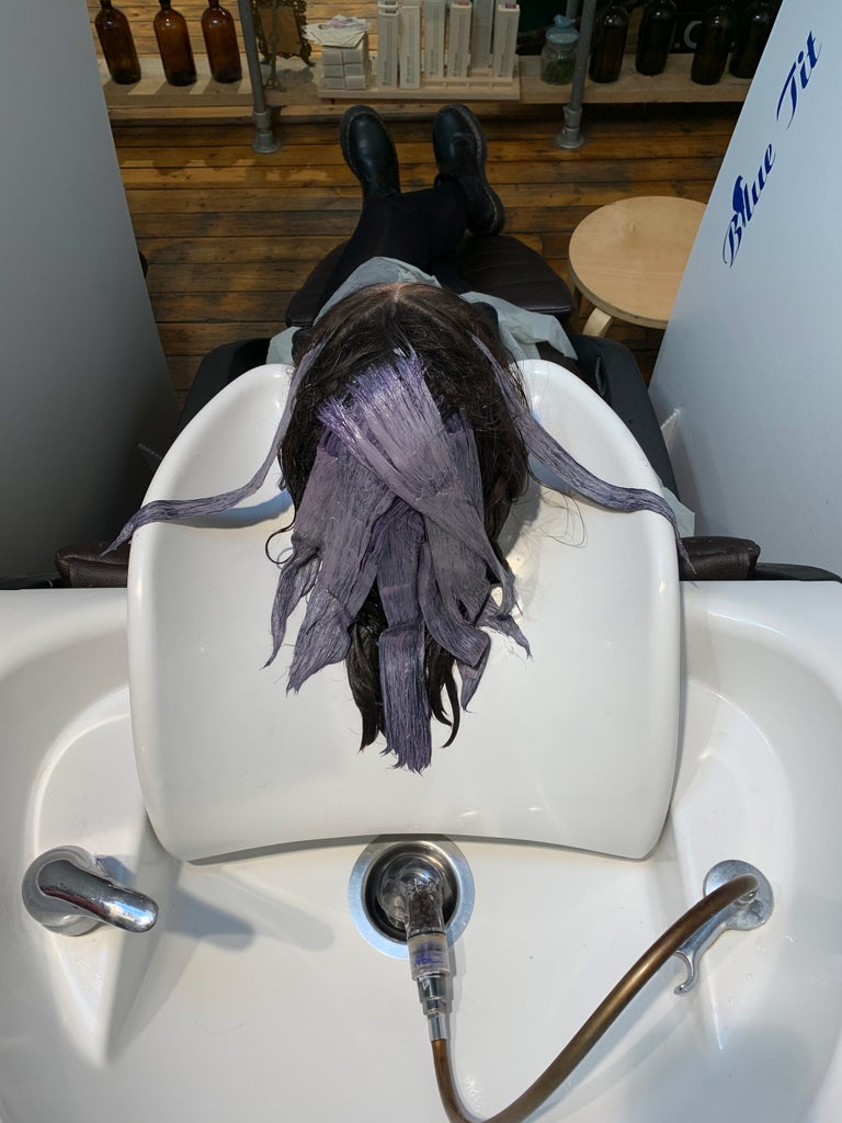 Inspired by TikTok’s modern emo kids and New York salon Sally Hershberger‘s beautiful blue creations, I booked in to Blue Tit in London’s Dalston neighborhood — one of the most innovative salons for trending color — for my hair makeover. Colorist Declan Haworth has a roster of celebrity clients, from Jessica Woodley to Jack Saunders, and knows exactly how to make hair pop. My hair is naturally brown so some pre-lightening was inevitable and, as it’s pretty dark, it had to be bleach. To save my strands from too much damage, we decided to turn just the top section blue — a smart tip for anyone with thick hair, or a lot of it. This meant that the blue strands would appear like a veil of color over the brown but still make a noticeable difference, with minimal damage.