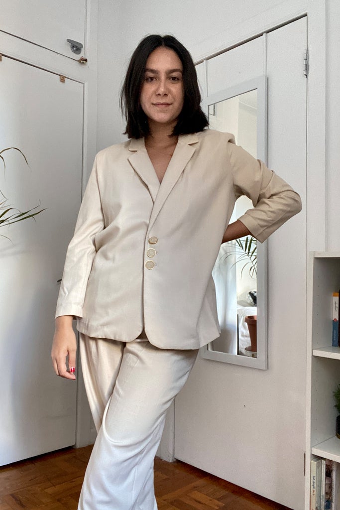 Enthused by the promise of a return to IRL offices following vaccinations, we were both inspired to make clothes for work. I sent her inspiration photos of a few of Princess Diana’s monochrome suits and spent hours at the local fabric store, one of the few remaining in my hometown of Caguas, walking the aisles filled with organza, taffeta, silk, and cotton fabrics to find the perfect linen and polyester blends to make mix-and-matchable suits.
