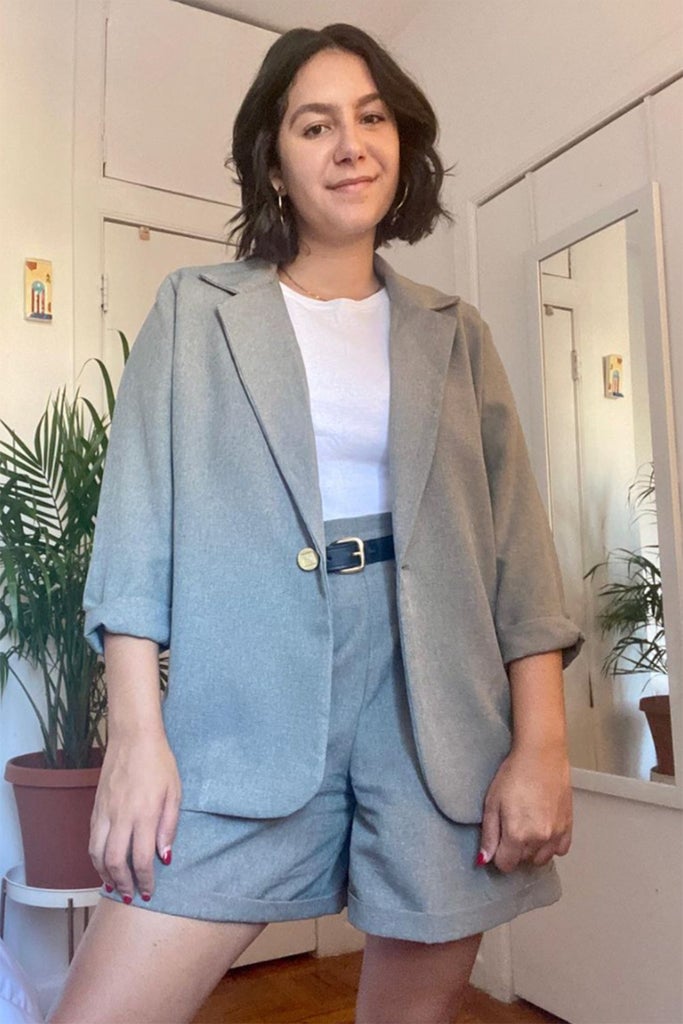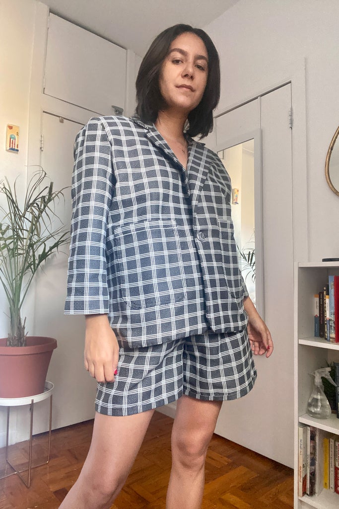 While my mom and I have not shown our collaborations at New York Fashion Week (yet!), the process of making clothes together for five months both challenged and connected us, deepening our relationship. We started with a gray checked two-piece shorts suit with oversized ‘80s padded shoulders. I was transported to my childhood whenever my mom would ask me to come into her sewing room to get fitted. Decades later, I still knew the drill: get undressed, stand patiently, watch out for sharp pins, and repeat. This time, I got comfortable enough to make suggestions to shorten the hemlines or place the button a little higher.
