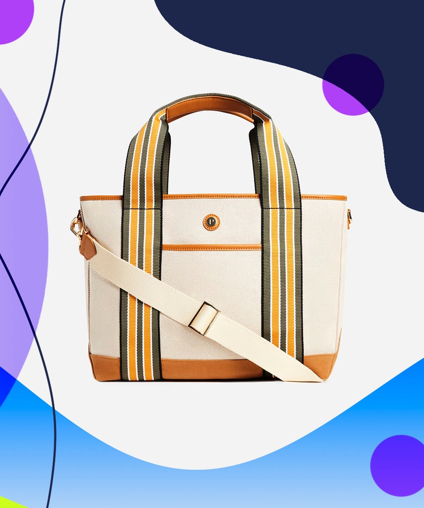 Just like its larger-sized counterpart, the Small Cabana Tote is made from a lightweight and spill-proof canvas derived from 30 upcycled plastic water bottles. (Wine and coffee can leave their stains elsewhere.) There are four cute colorways to choose from, and you have the option to add a monogram for a touch of personalization. Newer features that are exclusive to the Small Cabana Tote include a zip-top closure to keep all your stuff secure and an adjustable, removable shoulder strap that allows you to go hands-free as well as an all-vegan leather base and trim. Plus, we always love a charming preppy moment, especially with the striped accents.